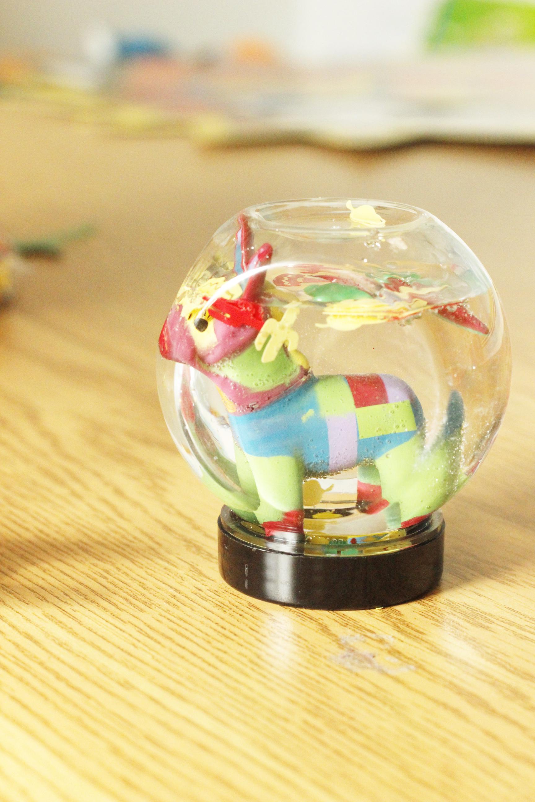 Prep the sombreros and the chili peppers. Take the sombreros off the earring post and the chili peppers off the picks. Place the fiesta donkey inside the jar first. It fits perfectly! Note: if you add the dokey last, the confetti tends to get stuck around the donkey’s head. Add one or two sombreros to the jar. Add some chili peppers. Add the fiesta confetti. Use a good amount of these, but not too much! You still want to be able to see the donkey.