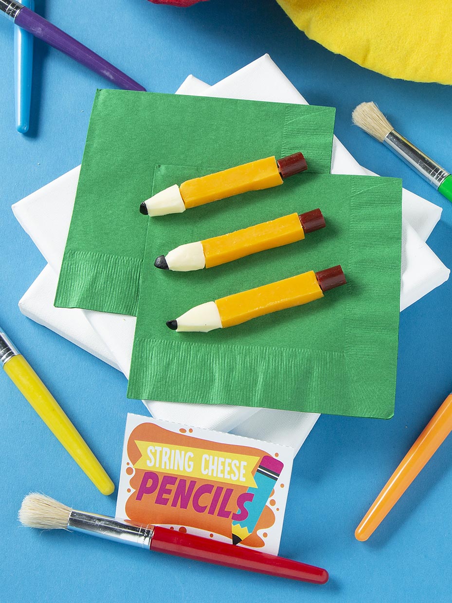 Cut cheddar string cheese in half. Cut light-colored string cheese into a cone shape and use a toothpick to stick it onto one end of the cheddar cheese. Cut a small piece of a beef stick and use a toothpick to attach it to the cheddar string cheese. Optional: cut a small piece of a black olive and attach it to the end of the pencil – the juice from the olive will help it stick! Be sure to let students know that the toothpicks are inside. Get your free printables food labels here!