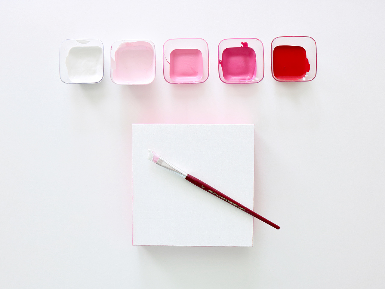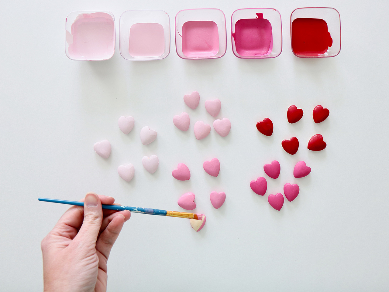 Count out 25 DIY Unfinished Wood Heart Shaped Beads and separate them into five piles of five beads. Mix small amounts white, pink and red paint together in Mini Clear Appetizer Plastic Bowls to achieve five varying shades of paint from light pink to red. Paint each set of five beads with one shade of each of the paints.