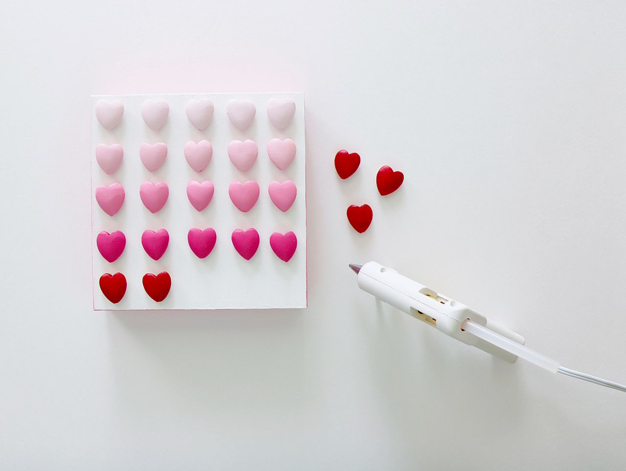 Measure to find the center of the sign and then use a small dab of hot glue to adhere one of the light pink beads to the top middle of the painted DIY Unfinished Wood Box Frame. Continue adding the beads to the sign in straight rows from the lightest pink at the top to the red beads at the bottom.