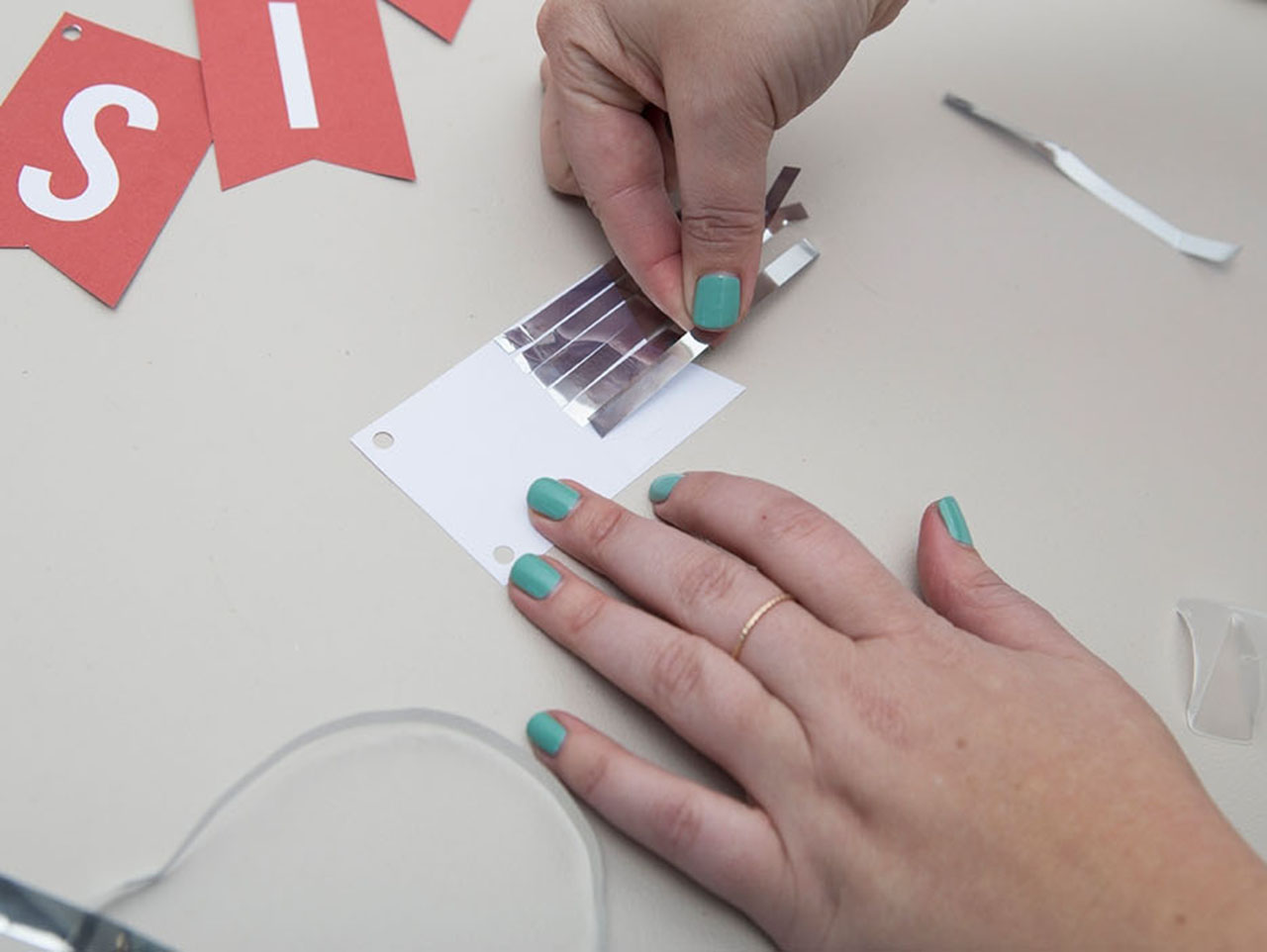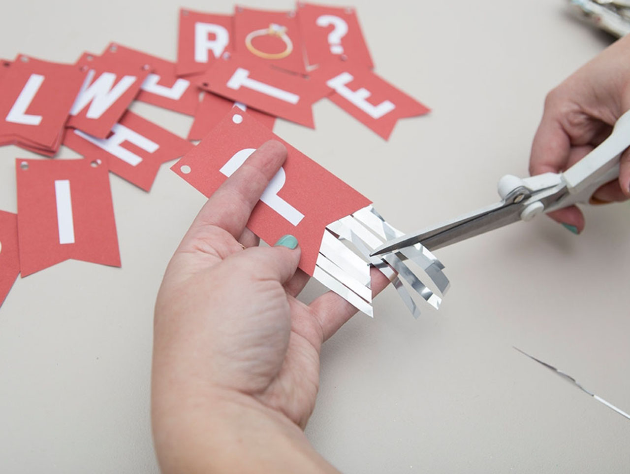 Using your favorite adhesive, glue the fringe strands onto the back of each letter.