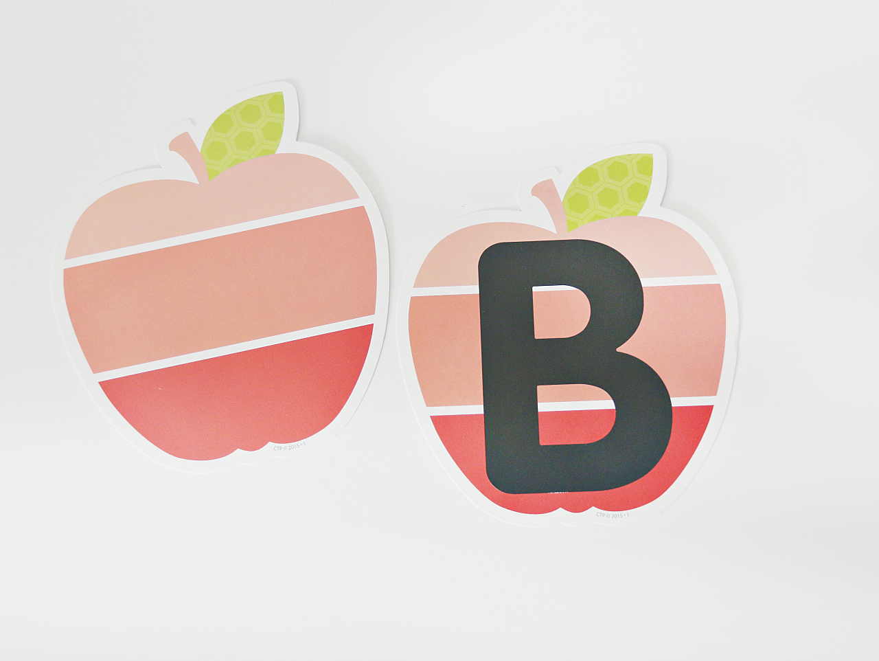 We recommend using 2"-4" adhesive letter stickers or use a permanent marker. Add the letters and numbers or write them so it spells: "Back 2 School" to the front of the Apple Cutouts one at a time. Center each letter and number in the middle of the apple.