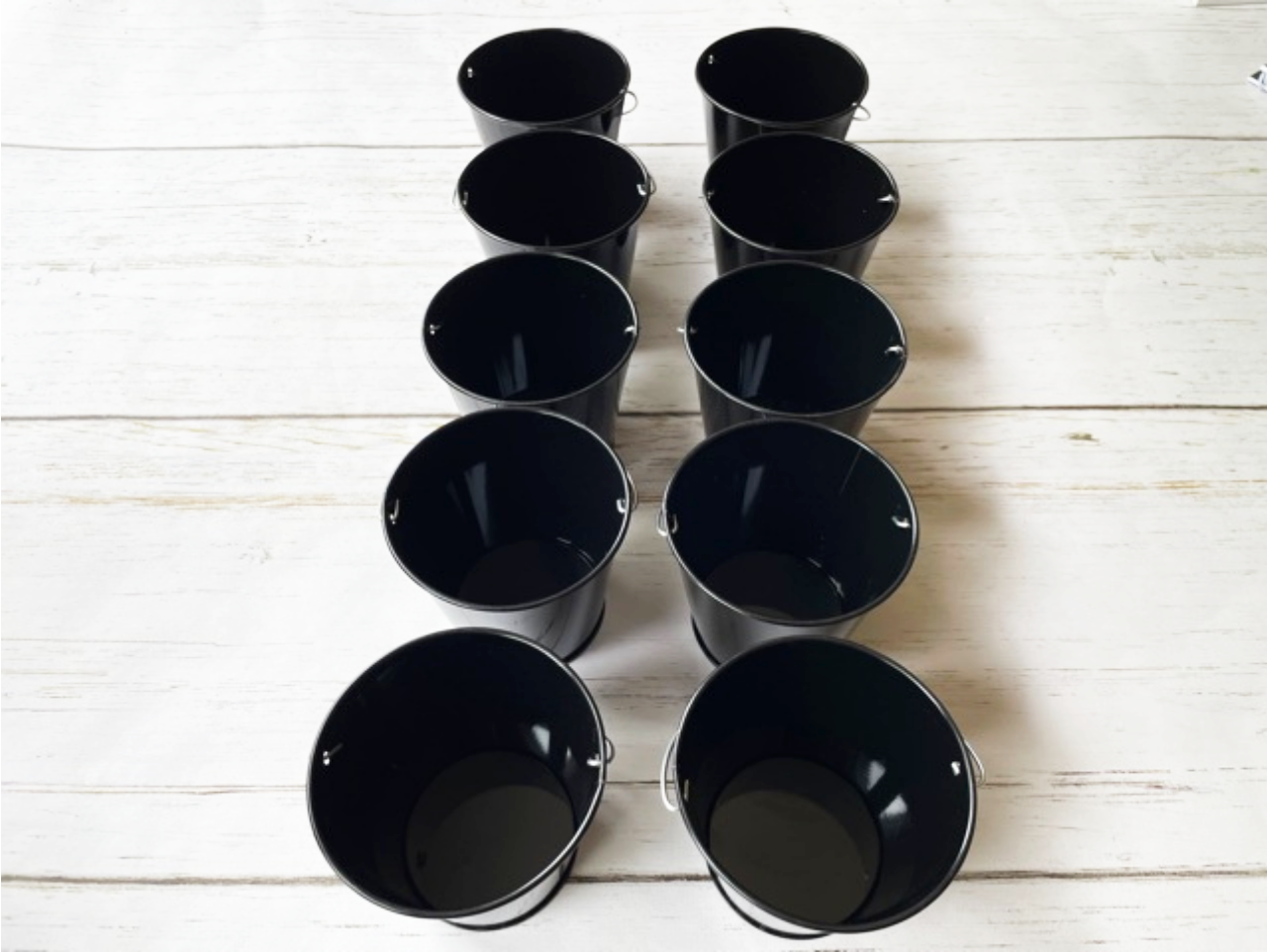 Line up all of the buckets in a simple line, so they are easy to stuff. I made one line for student gifts and one line for parent gifts. These buckets are wonderful because they can be repurposed easily!