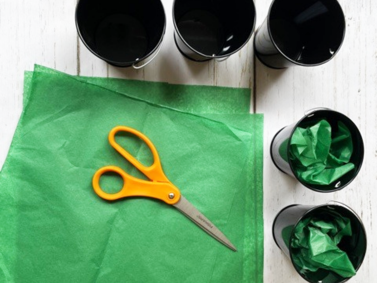 To make the parent gifts a bit fuller, I cut some tissue paper into fourths. I used my favorite Fiskar Scissors. I then stuffed the bottom of the bucket with the tissue paper. The items will sit on top of the tissue paper instead of falling below the brim.