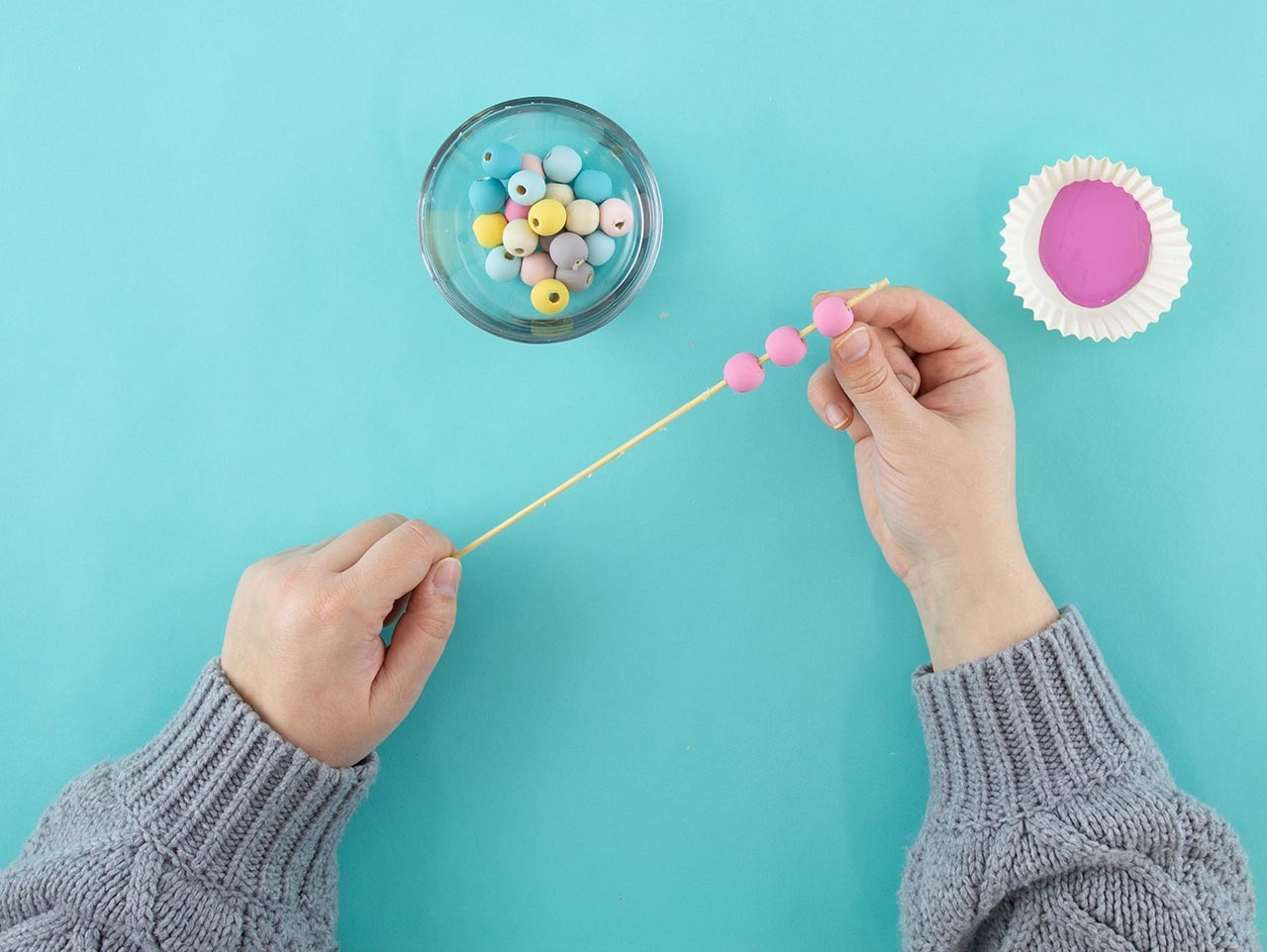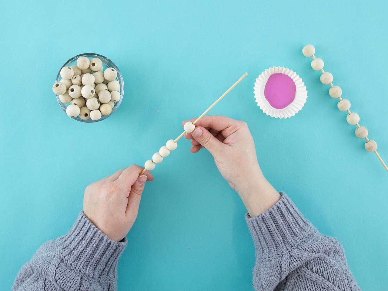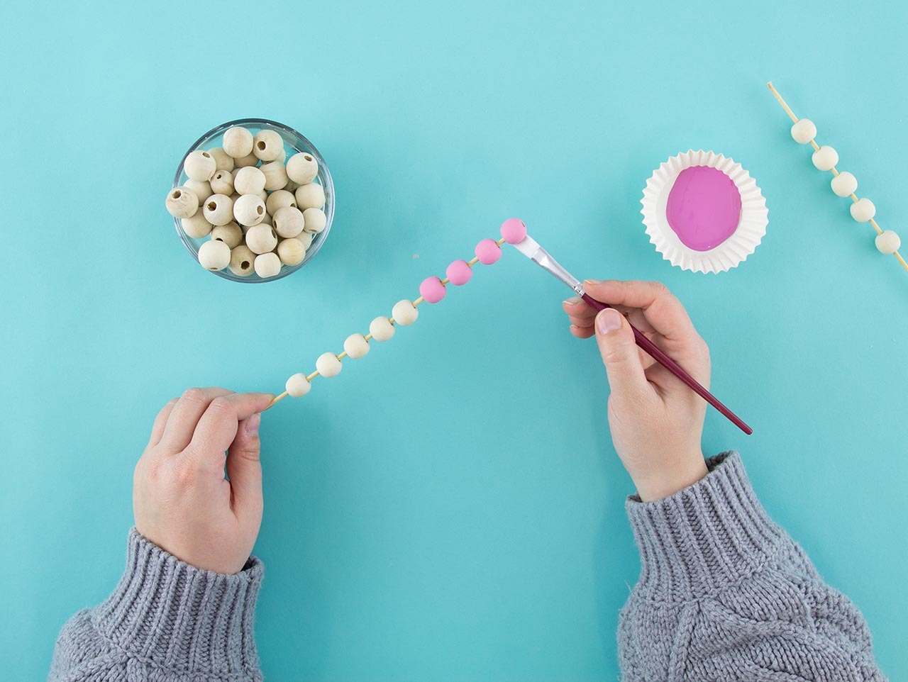 Paint the beads with a flat-bristled paintbrush and acrylic paint. Stand them up in a tall vase or cup to dry.
