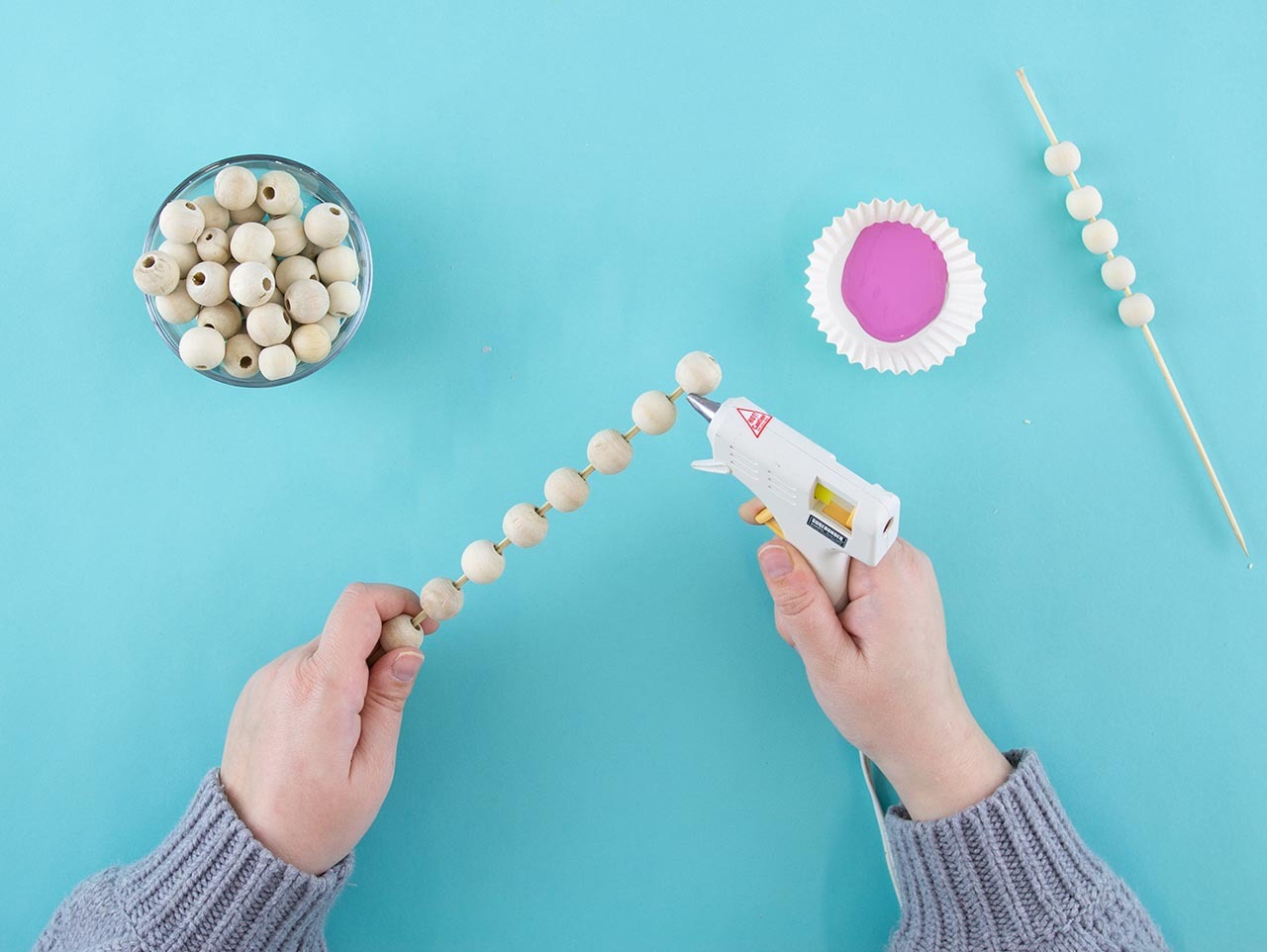 Let's begin by painting the beads. Here's a tip: to easily paint the wood beads, use a tiny drop of hot glue to lightly secure each of the Round Unfinished Wood Beads to a bamboo skewer. This makes it easy to paint all sides of the beads.
