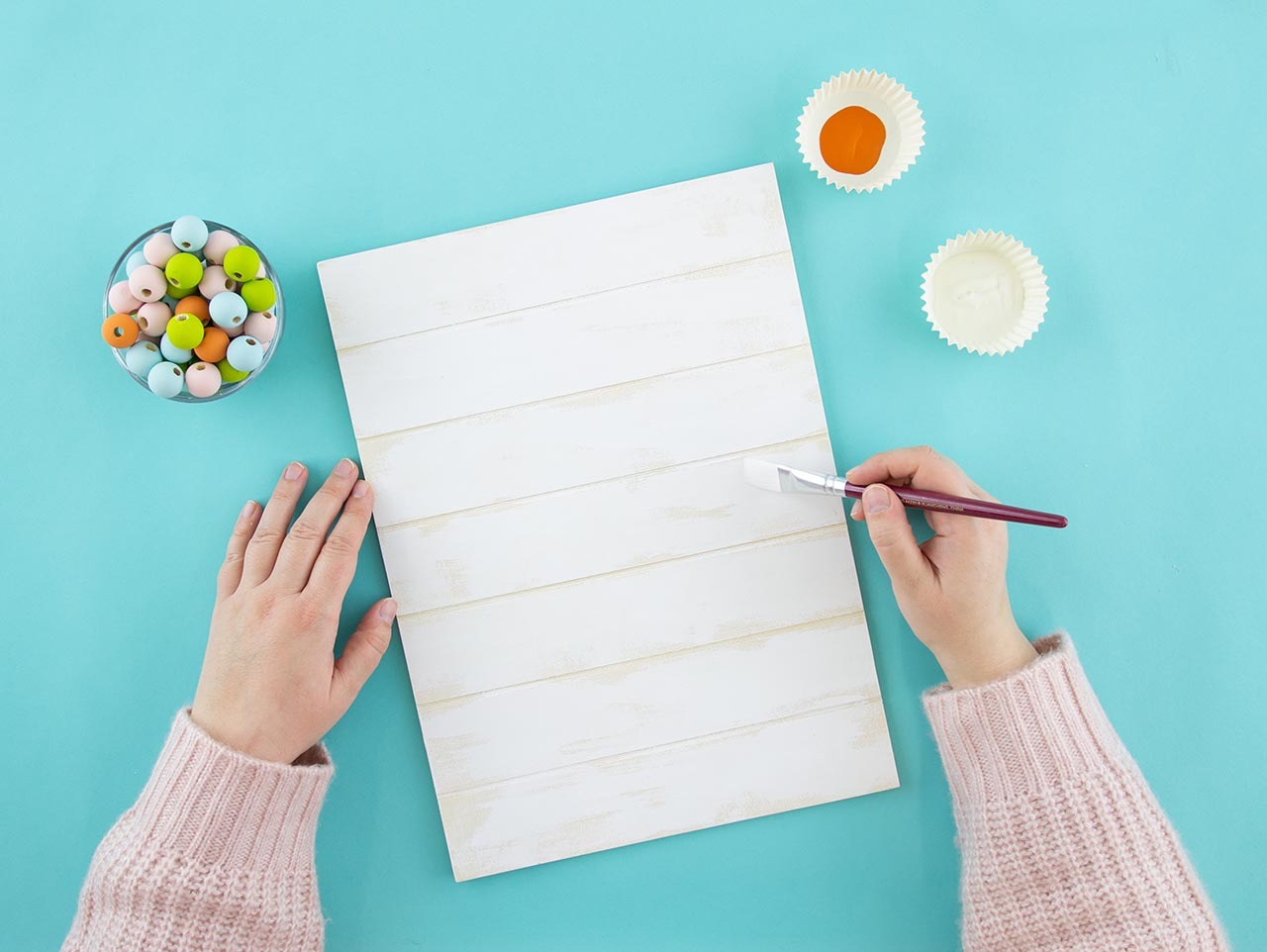 Use a Sponge Paintbrush or a flat-bristled paintbrush and acrylic paint to dry brush paint a DIY Wood Slat Sign. To achieve the dry brush look, lightly dip your paintbrush into the paint and lightly swipe the paintbrush over the wood surface without adding more paint to the brush. Repeat this process until there is no more paint on the brush. Having the wood show through the paint is the look you want to achieve.