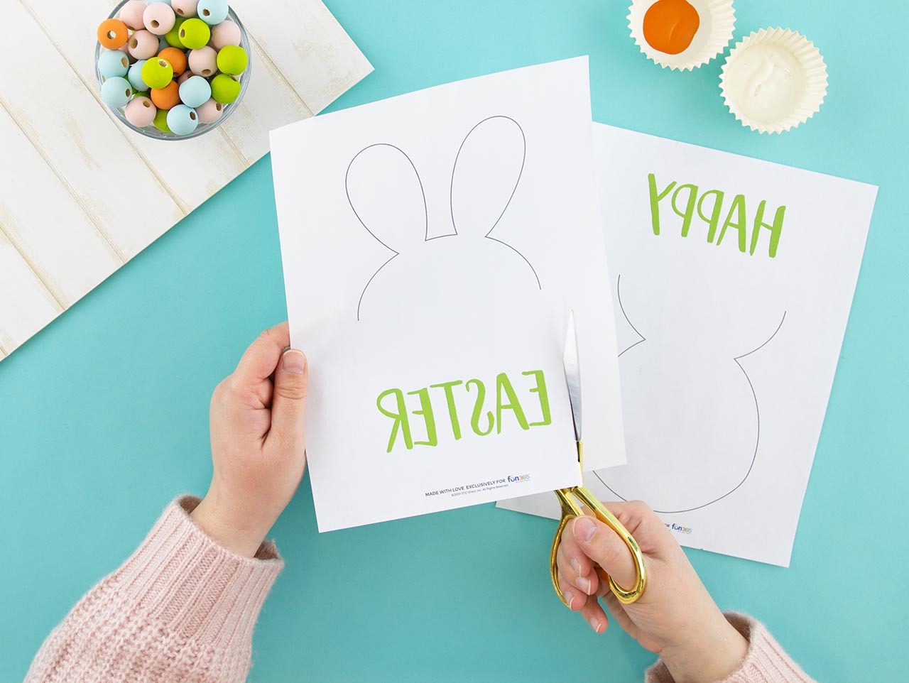 Download, print and cut out the bunny shape. Match the two shapes together to form a bunny. Use washi tape to hold the two shapes in place.