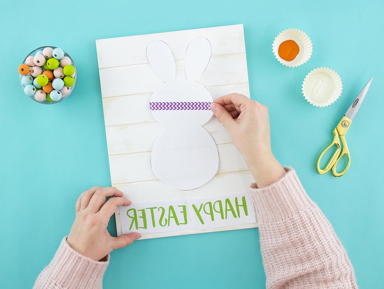 Arrange the words and bunny shape onto a DIY Slat Sign to your liking. Lightly trace the bunny shape with a pencil.