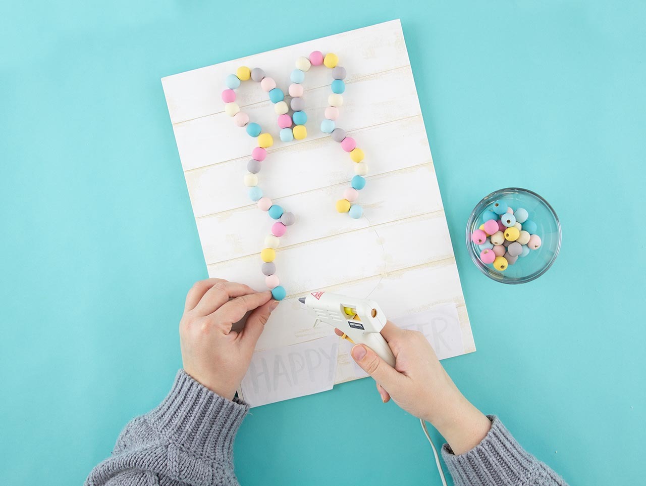 Once dry, remove the painted wood beads from the skewers. Using the traced bunny as a guide, adhere the beads to the wood sign with hot glue.