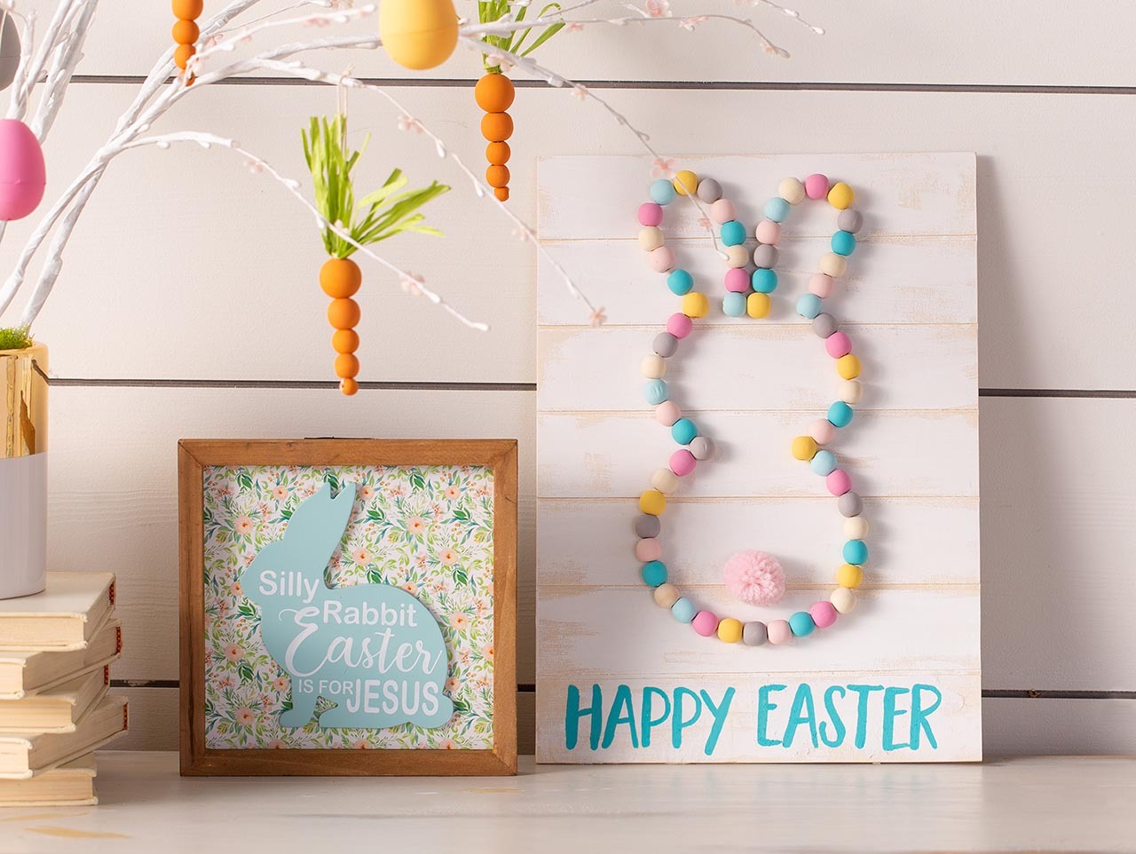 Once the Mod Podge is dry, glue a Pink Yarn Pom-Pom to the sign. Your cute DIY bunny sign is ready to enjoy as part of your Easter decorations or to give as a gift! (It even looks adorable at an Easter egg hunt!) Pair the DIY bunny sign with our Easter is for Jesus Decor Sign. You can also check out how to make the Beaded Carrot Easter Ornaments here.