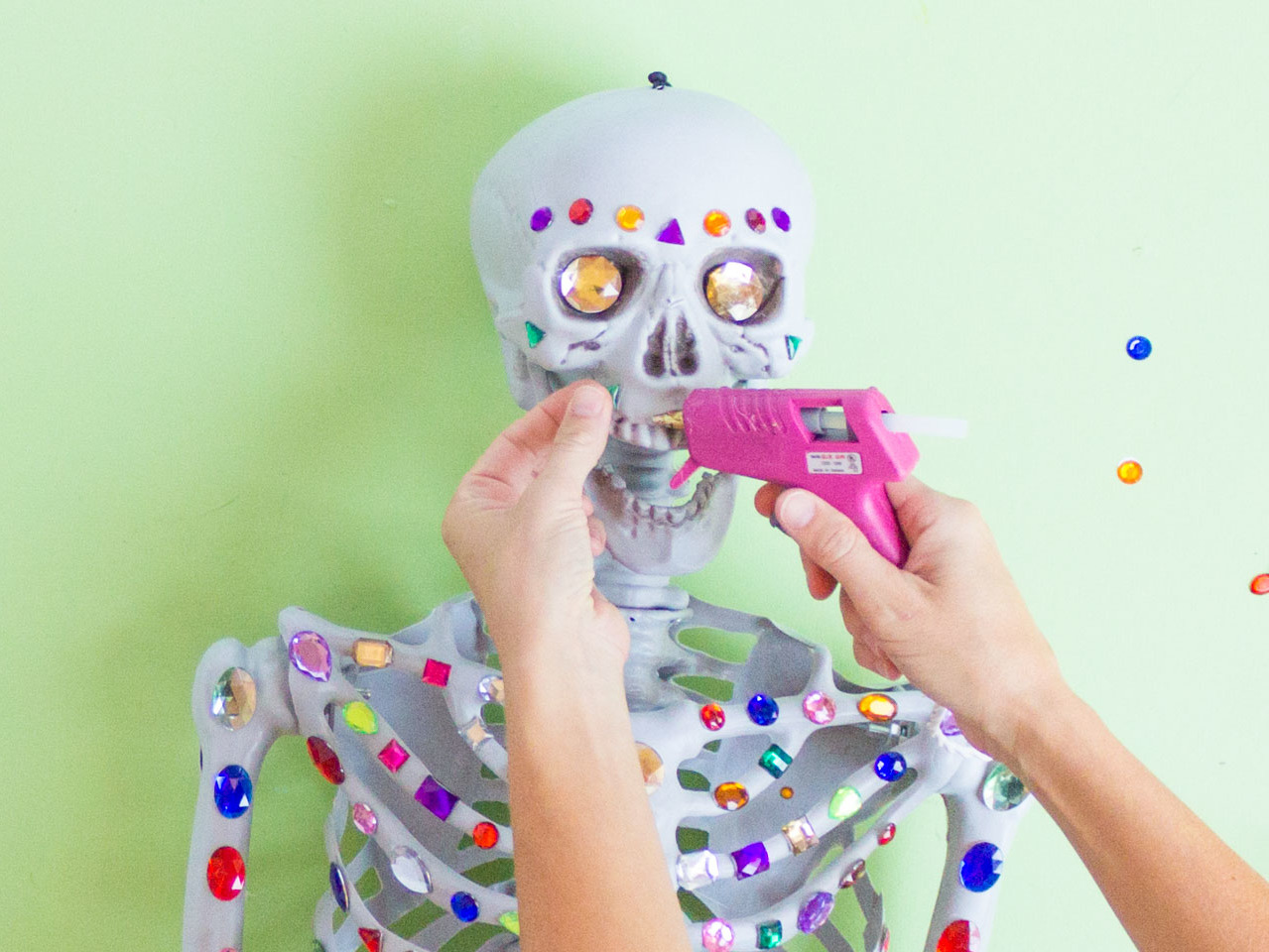 Finish by decorating the skeleton's legs with larger jewels. I added my jewels randomly, but you can get creative and make a pattern with the different colors and shapes of jewels if you like!