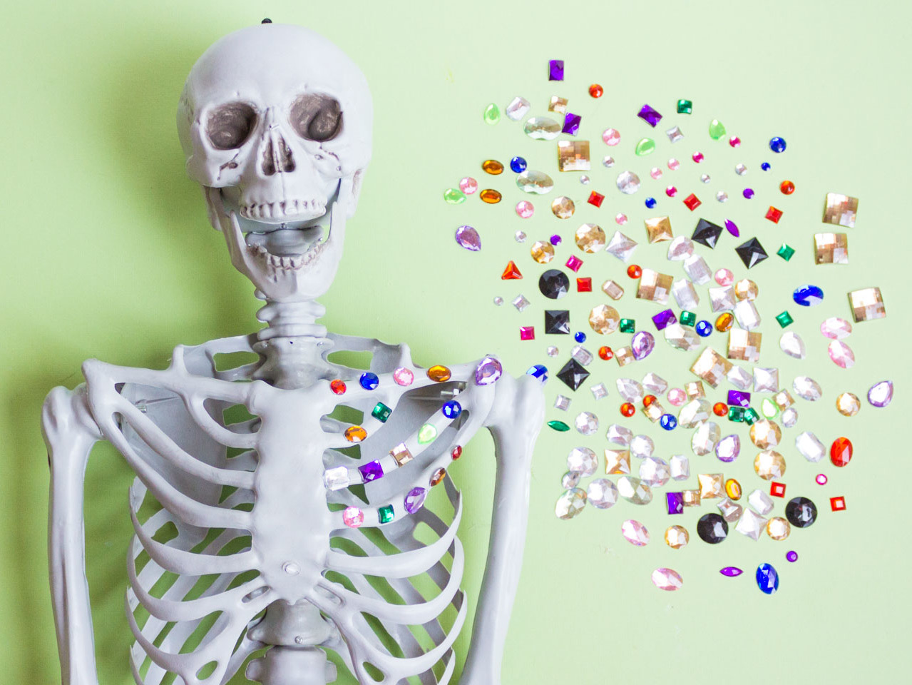 Display your newly bejeweled skeleton and enjoy. Why stop at jewels, when you can make a Pom-Pom Decorated Skeleton and Yarn-Bombed Skeleton too?