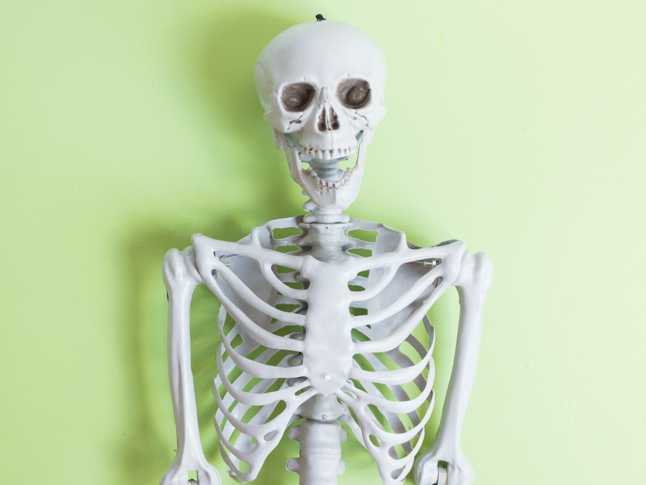 Start by laying a lifesize posable skeleton on a flat surface.