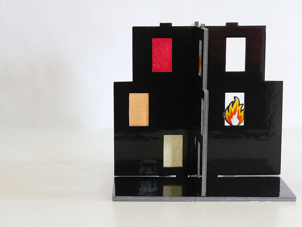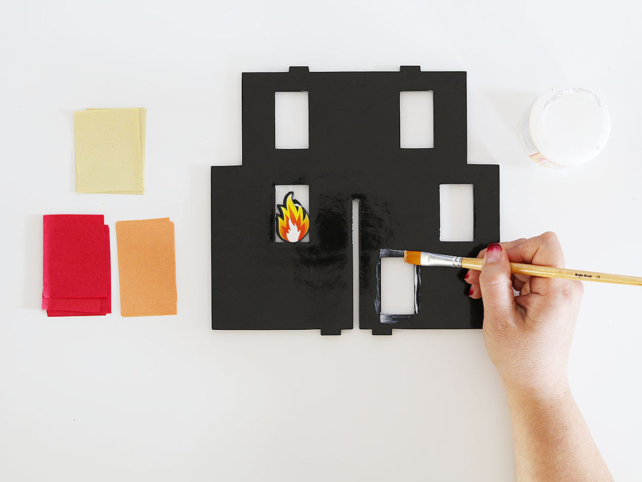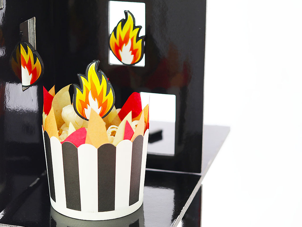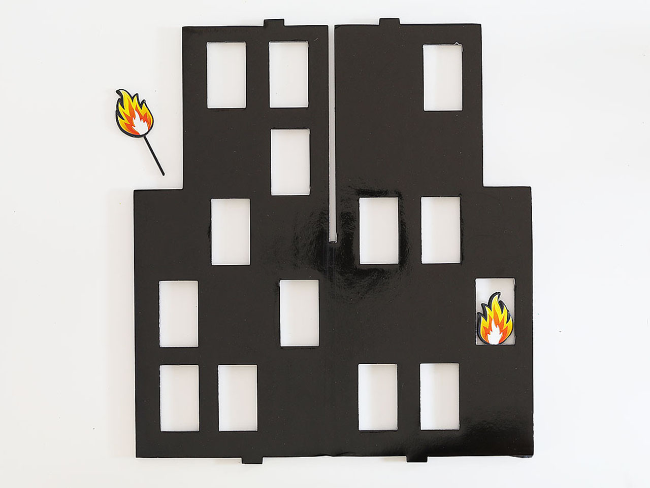 Insert the Firefighter Party Fire Picks into the foam window pane.