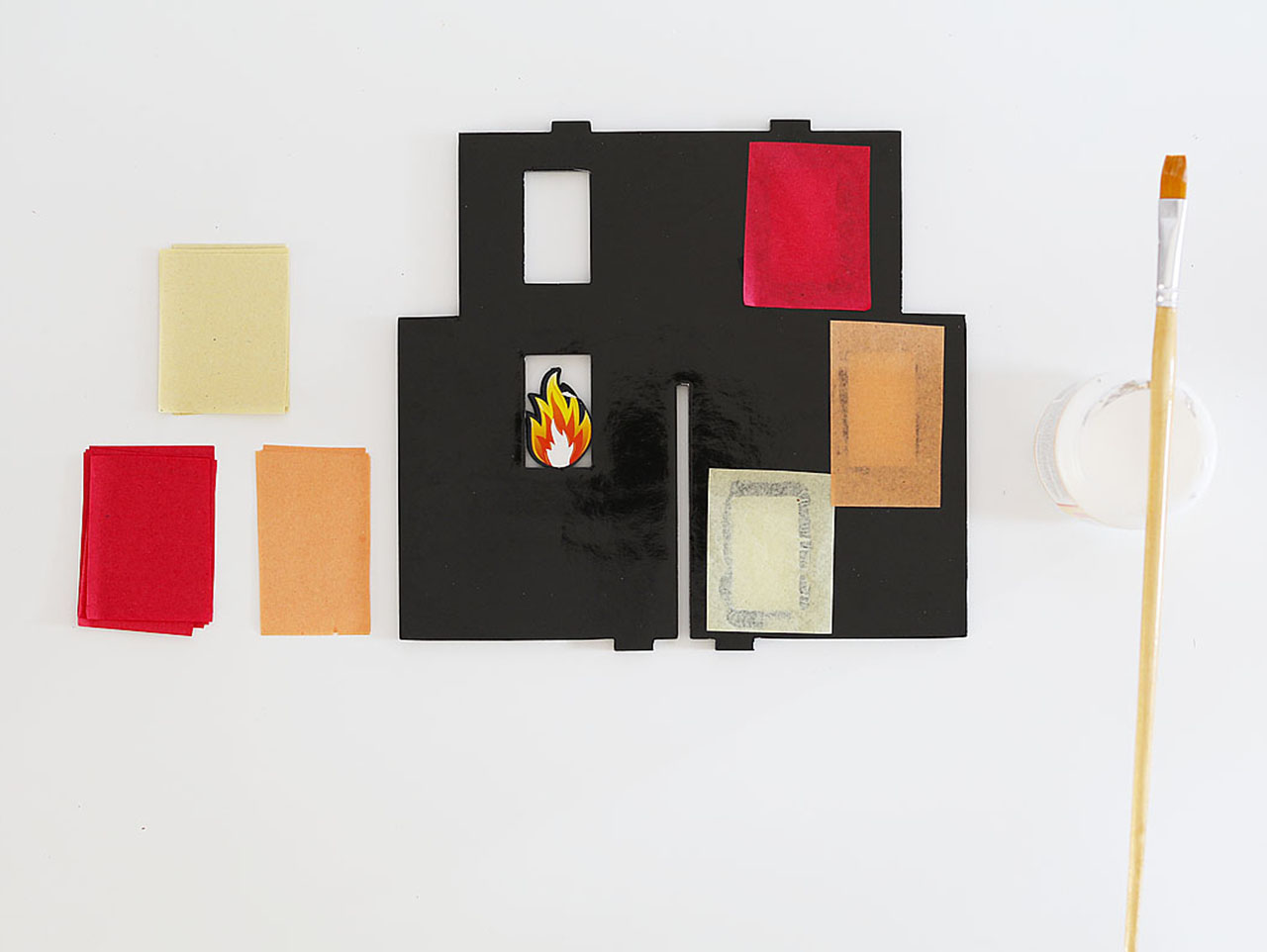 Place the small tissue rectangle on top of the Mod Podge. Repeat, alternating between the red, yellow and orange tissue paper.