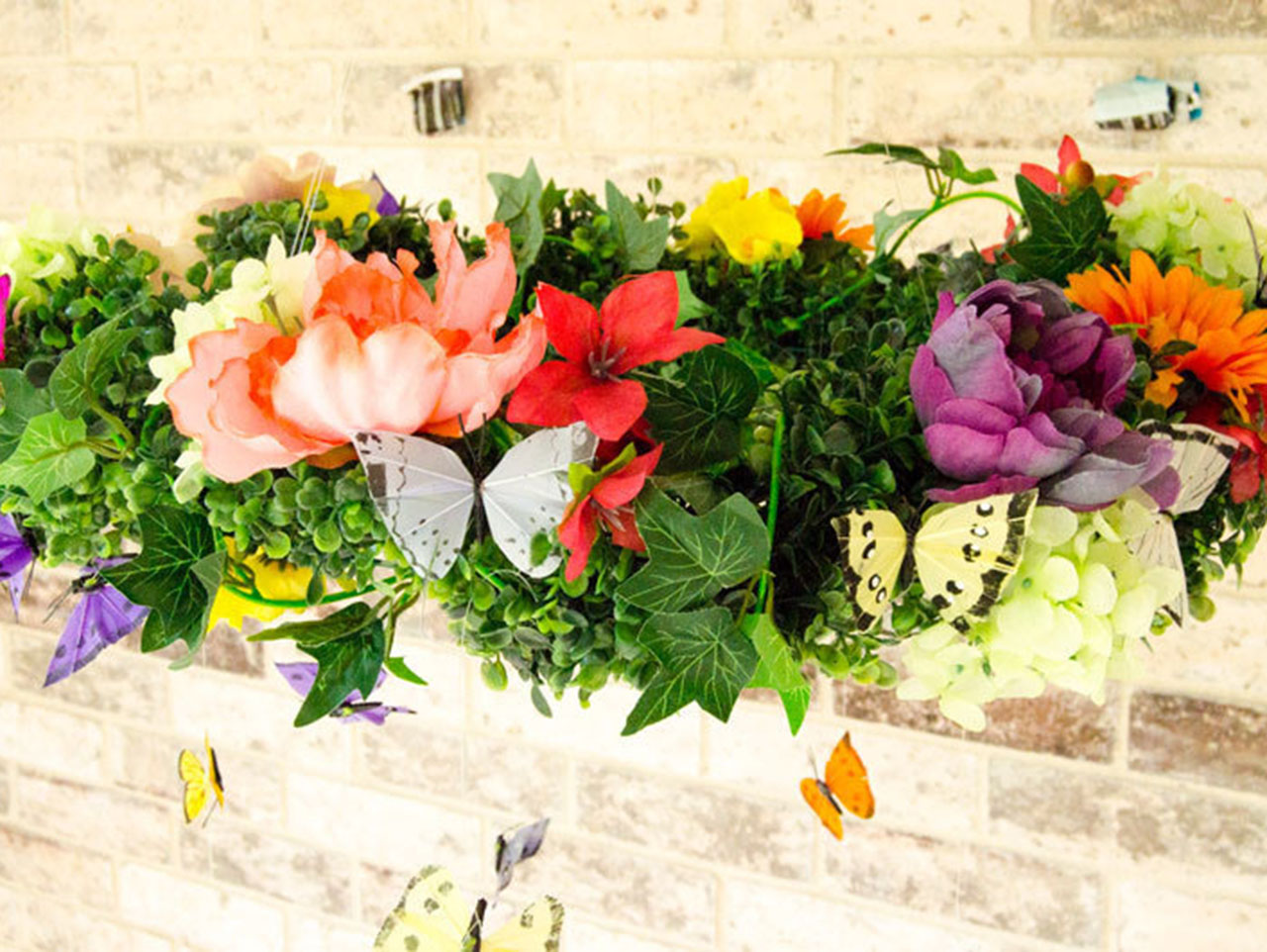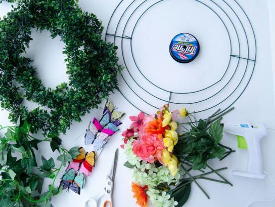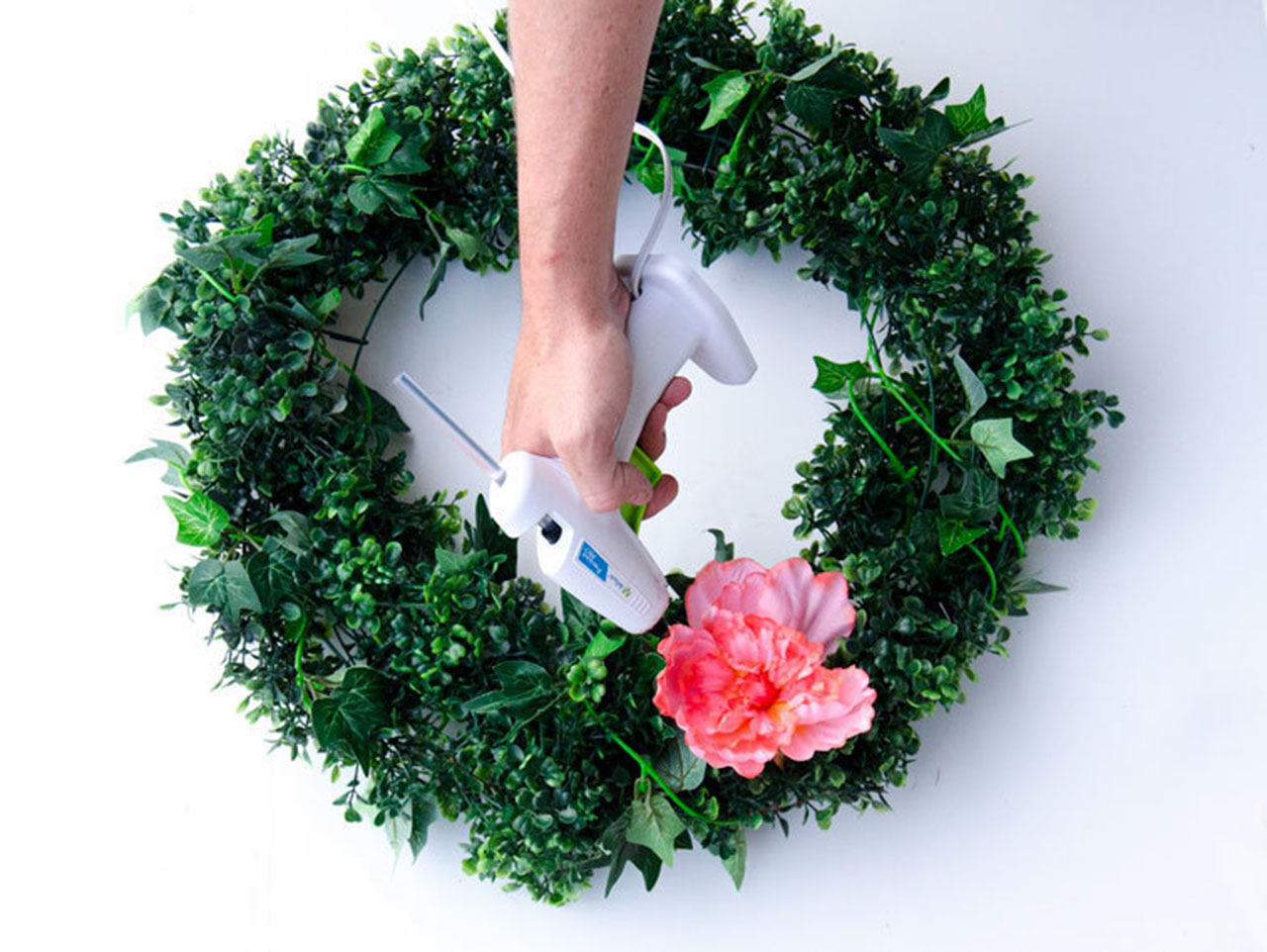 Take the faux flowers off their stems and hot glue to the Wreath Frame. Fill in the gaps and layer the flowers in bunches of three.