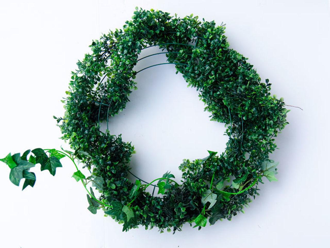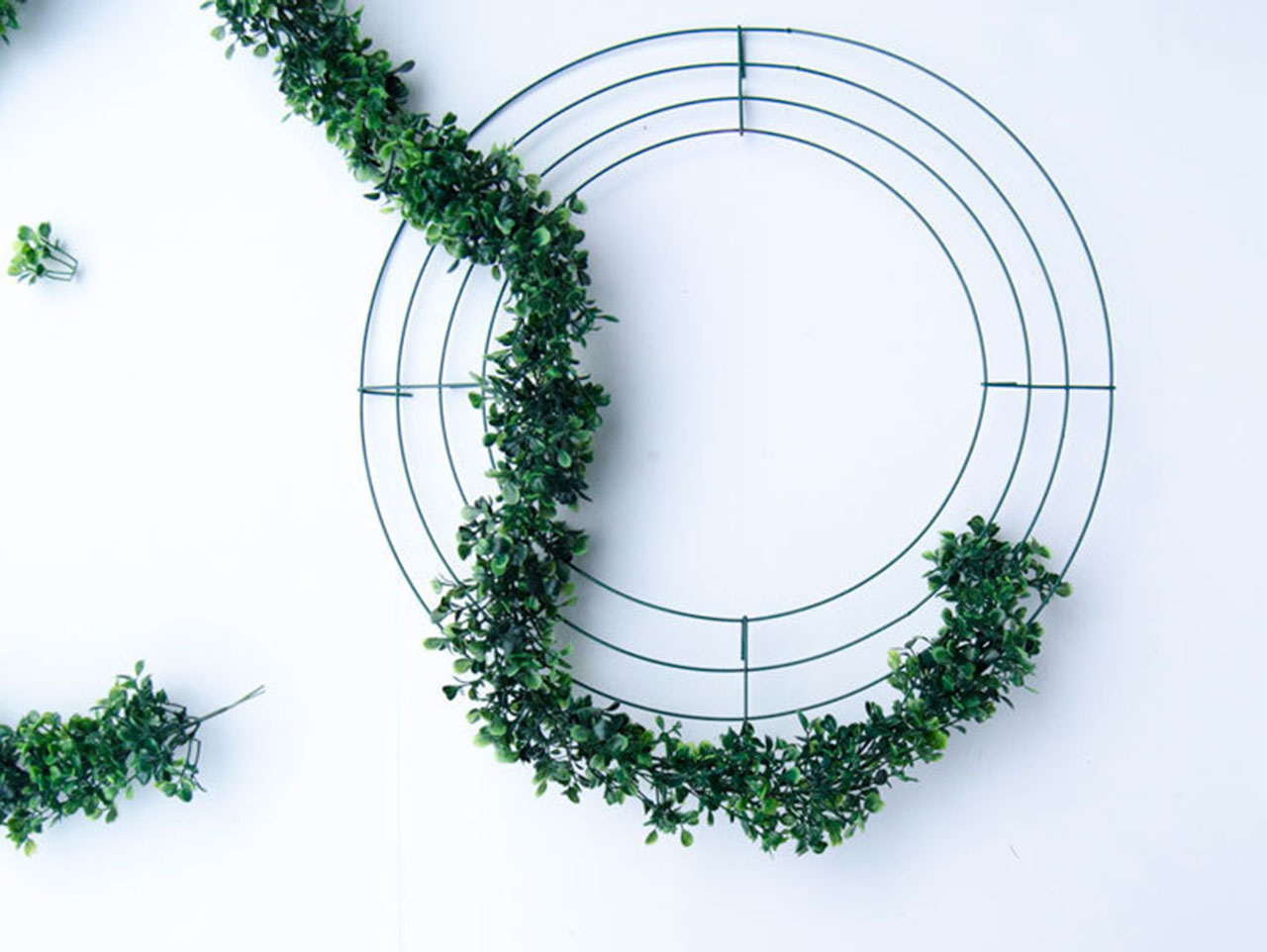 Wrap the Boxwood Garland around the Wreath Frame twice. Secure with fishing line or floral wire.