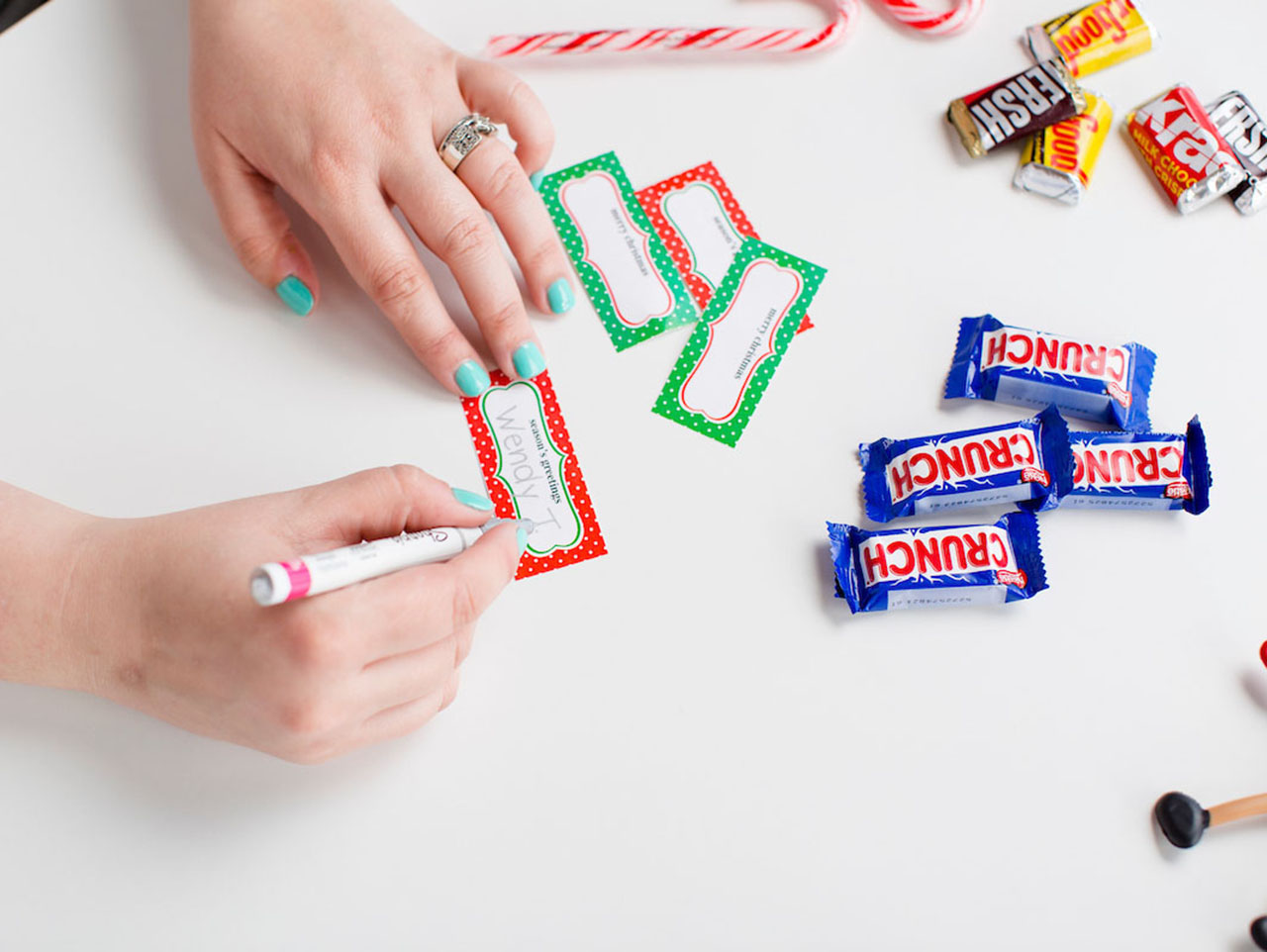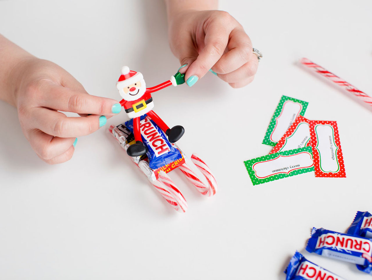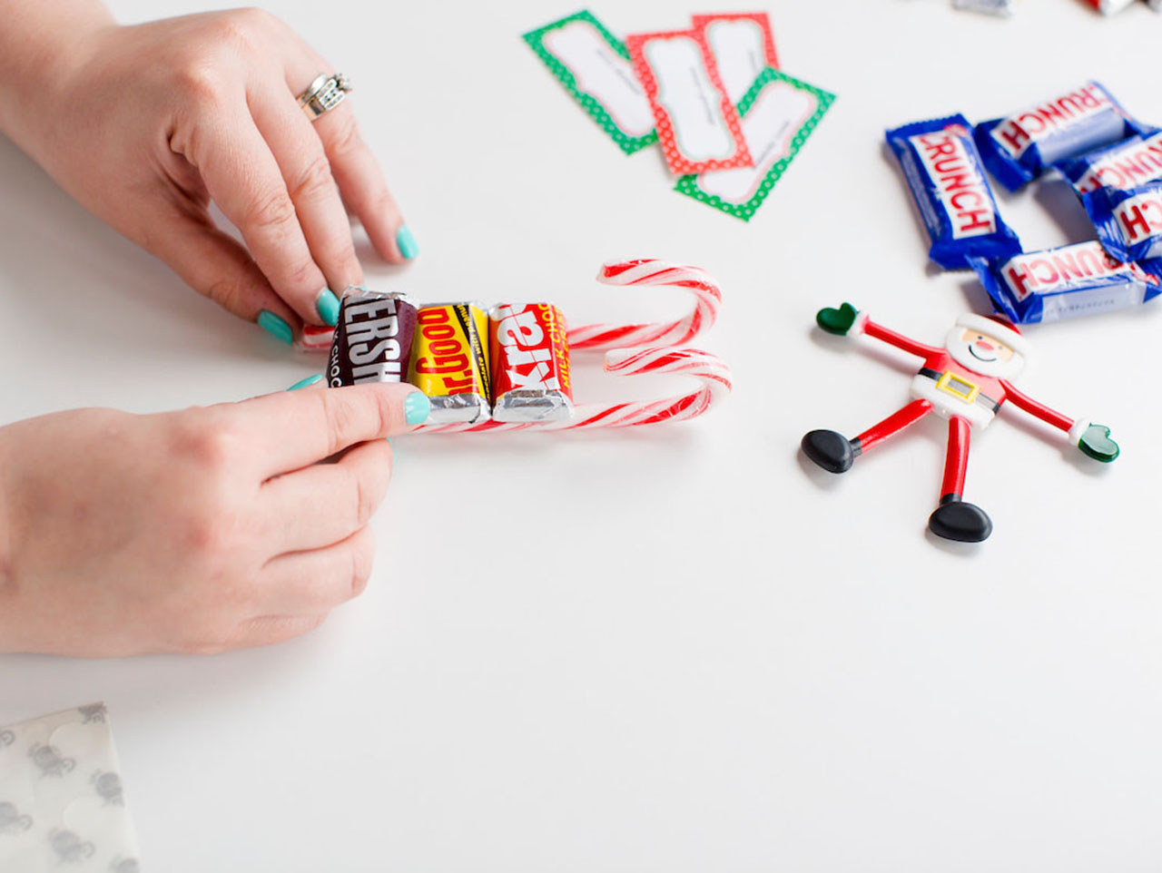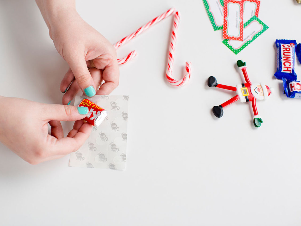 Use Glue Dots® to adhere three mini chocolate bars to two candy canes, making sure that the hooks of the cane are facing straight up.