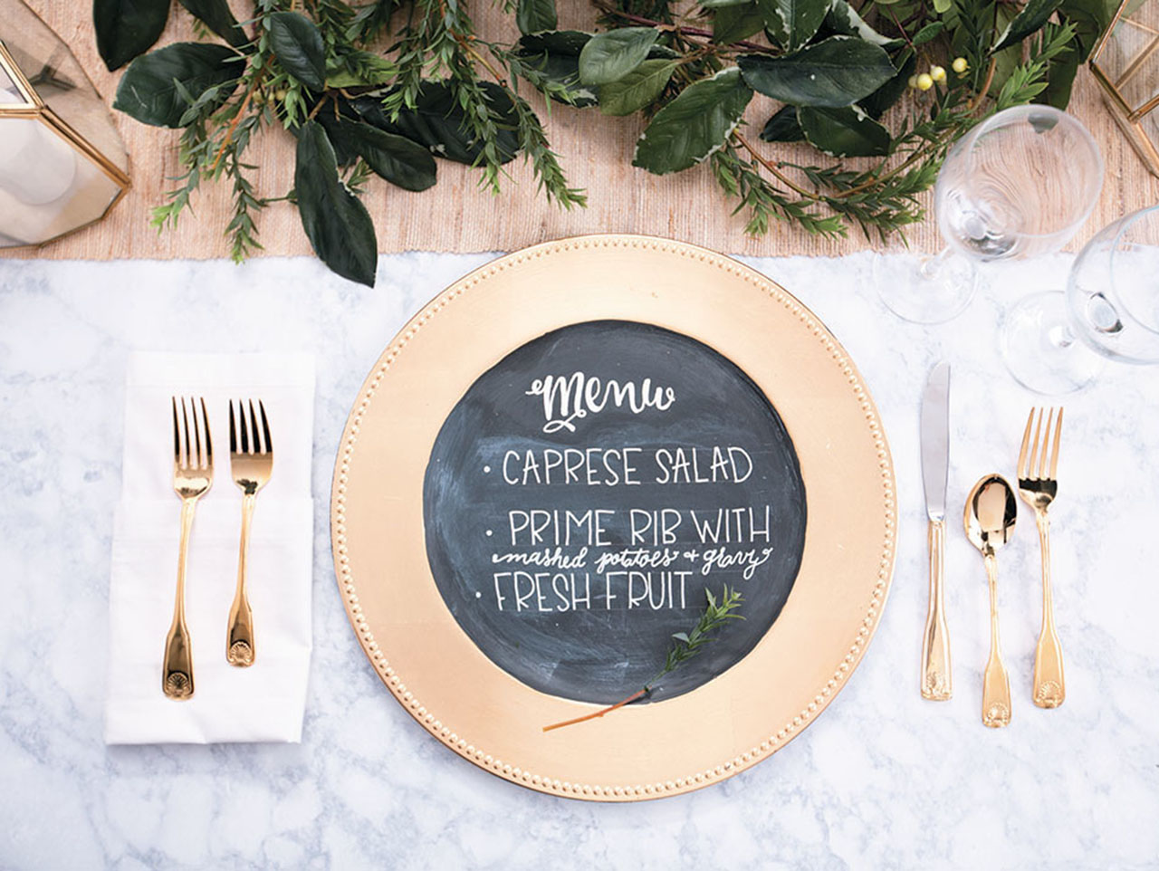Use a fine tip chalk marker to hand letter your wedding day menu onto the chalkboard charger. Be creative! Use a few different fonts to add interest, for a more whimsical look, doodle hearts etc.