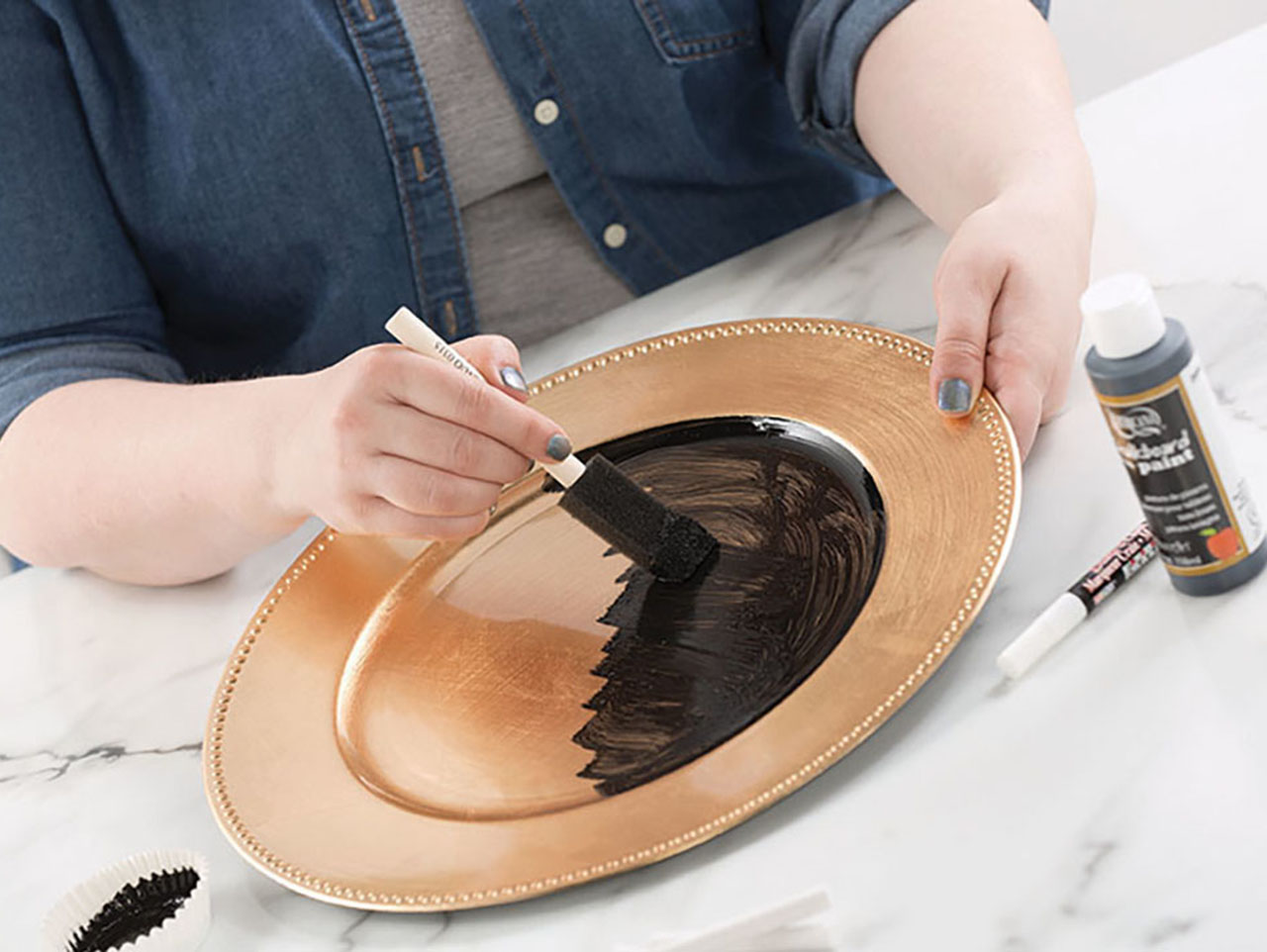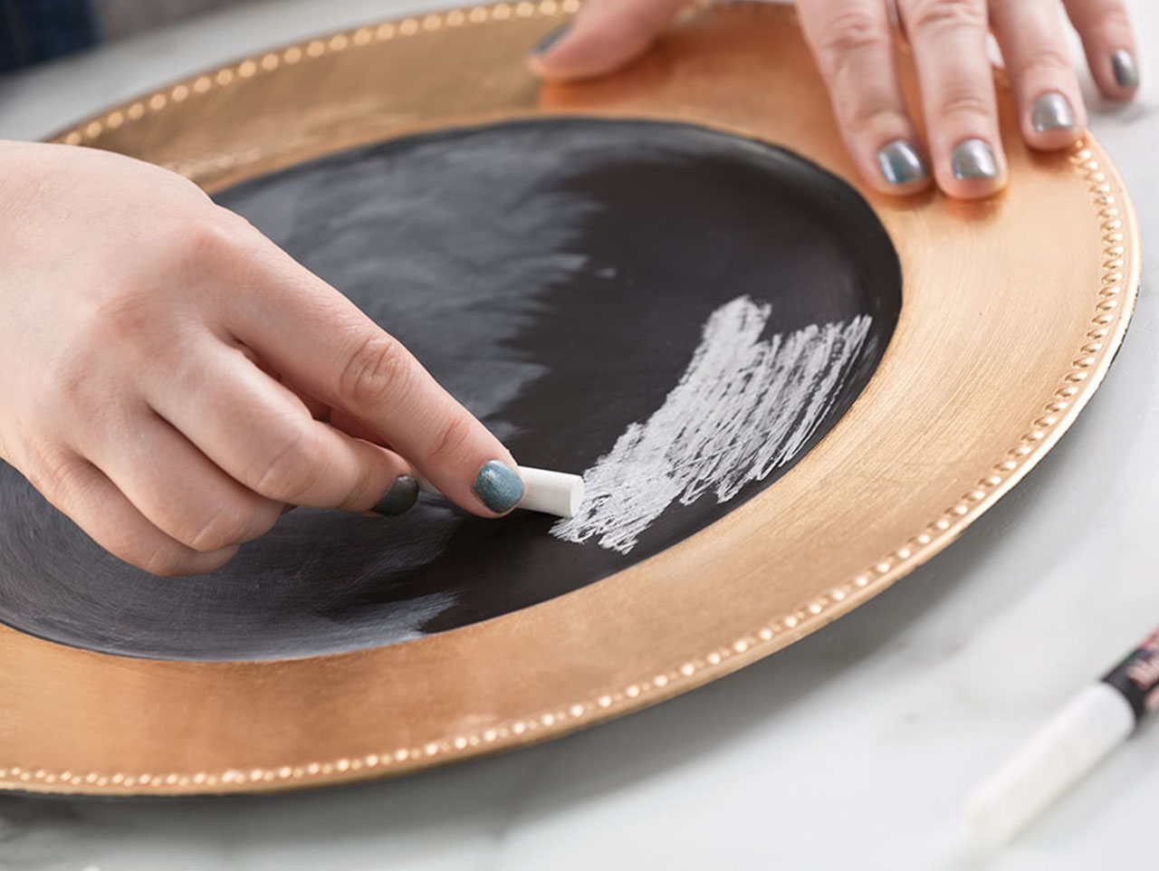 Paint the middle of a gold charger with chalkboard paint. We found it easiest to use a sponge paint brush to apply the paint using the inside rim of the charger as a guide. Apply 2 coats of chalkboard paint allowing time for the paint to dry in between coats.