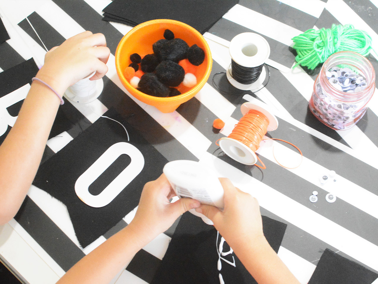 Start by putting out some black canvas banner pieces for your banner. They come in a stack of 12 so each child can do a few. Use white glue to embellish the black canvas any way your child likes. The creepier the better. You can use googly eyes, pom-poms, yarn, letter shapes, you name it. You can also decorate your banner with letters with a short phrase such as "Boo". You can use pre-cut letters or make your own with washi tape or simply paint letters on with white paint.