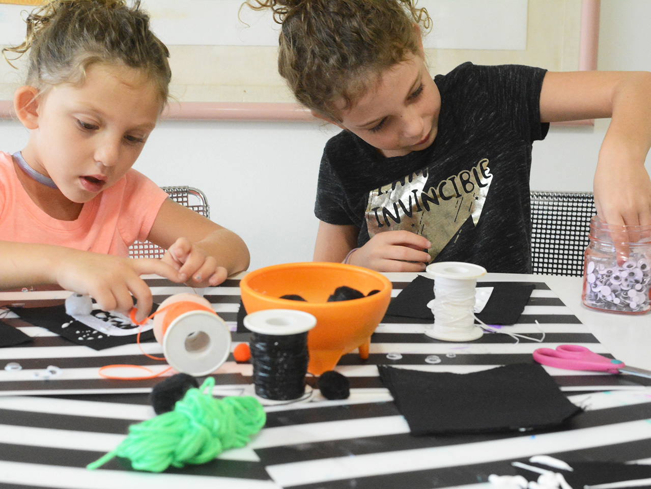 The canvas banners come in stacks of 12 so each child can create a few. Just encourage your child's creativity by saying things like "I notice you're coming up with some really creative ideas," Or "I wonder what creepy things you can do with those pom-poms?"