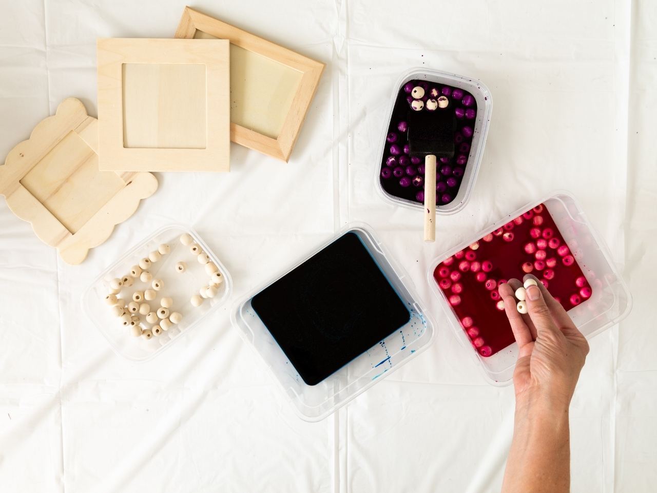 Now it's time to dye some wood beads! Simply drop the beads into the dye bath and let sit in dye for about five minutes. Remove the beads with a plastic spoon. Place onto a paper plate to dry.