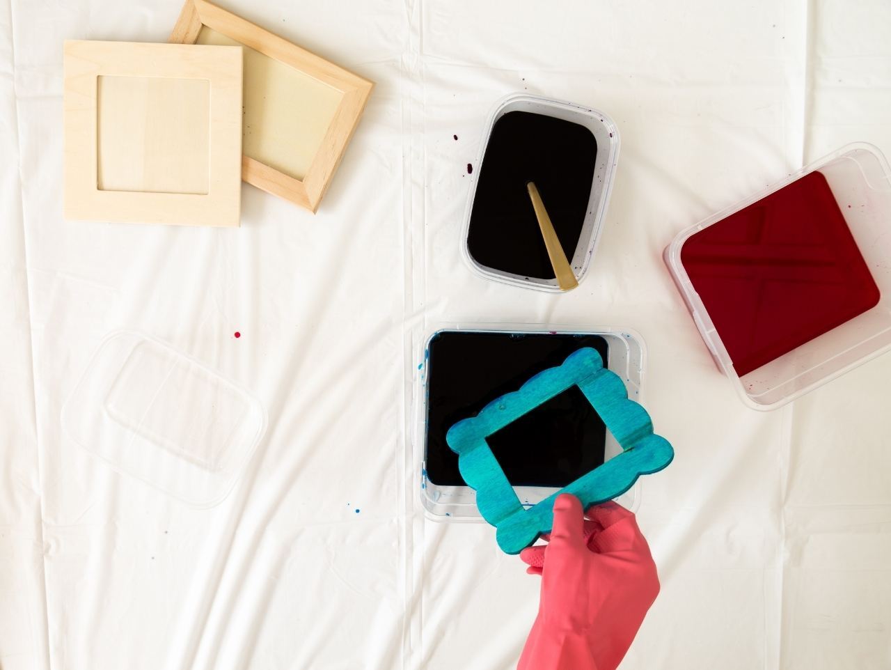 Time to put on the rubber gloves and dye some frames. On this frame we dipped each side into the dye bath. You only need to hold it in the dye for 30 seconds. This will give a uniform color on each side.