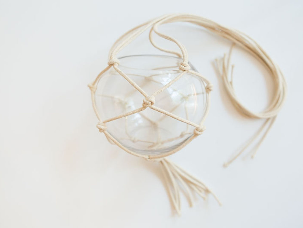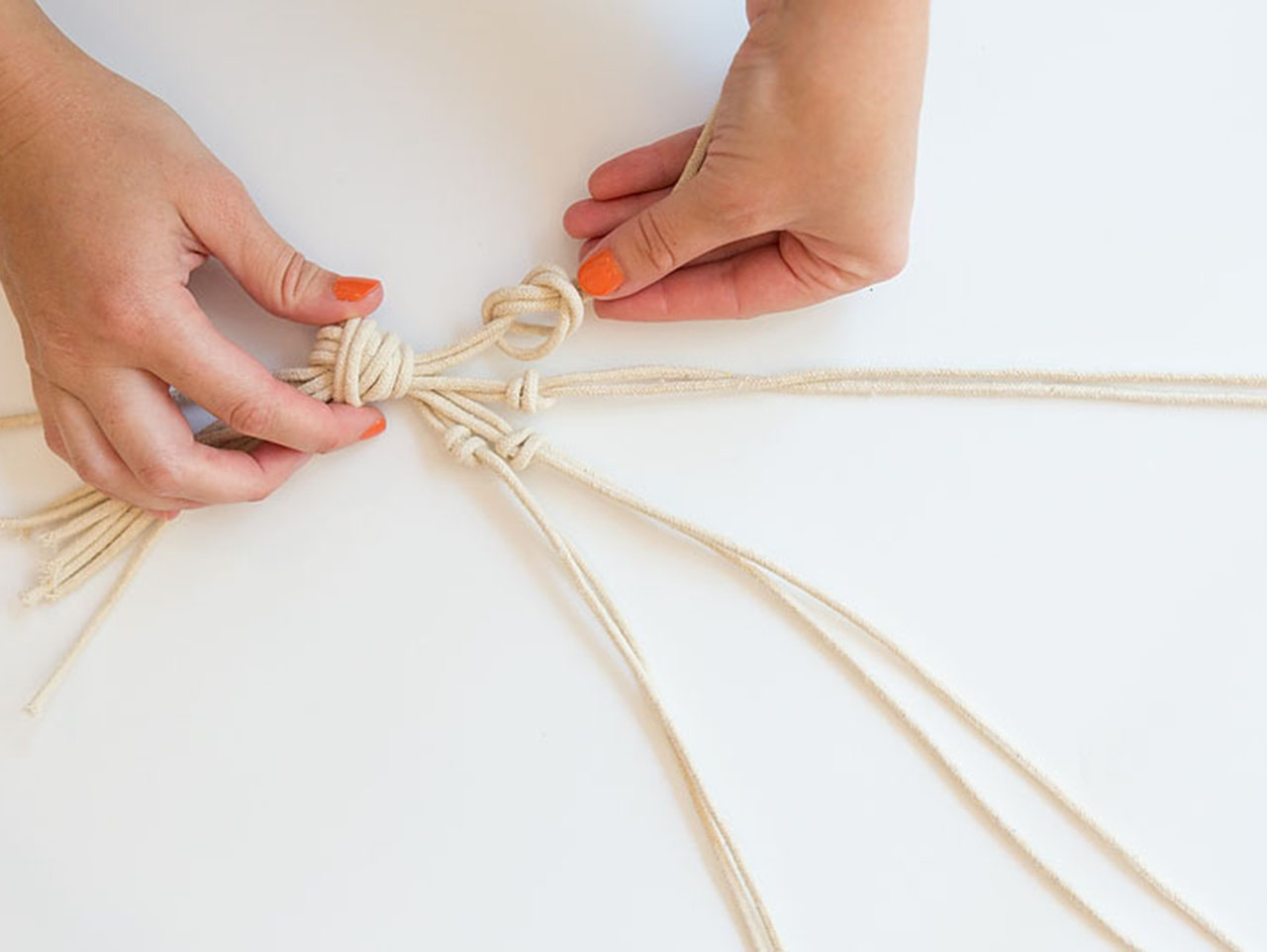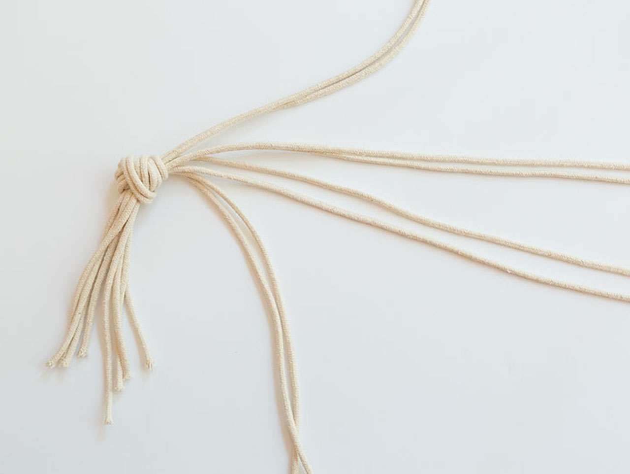 Begin by cutting eight pieces of natural cording into 50-inch pieces. This is a good standard length but if you would like your macrame to hang longer than I would suggest adding to this. Gather and tie all eight pieces into a large knot. Pull tight as this knot will be the base to support your vase.