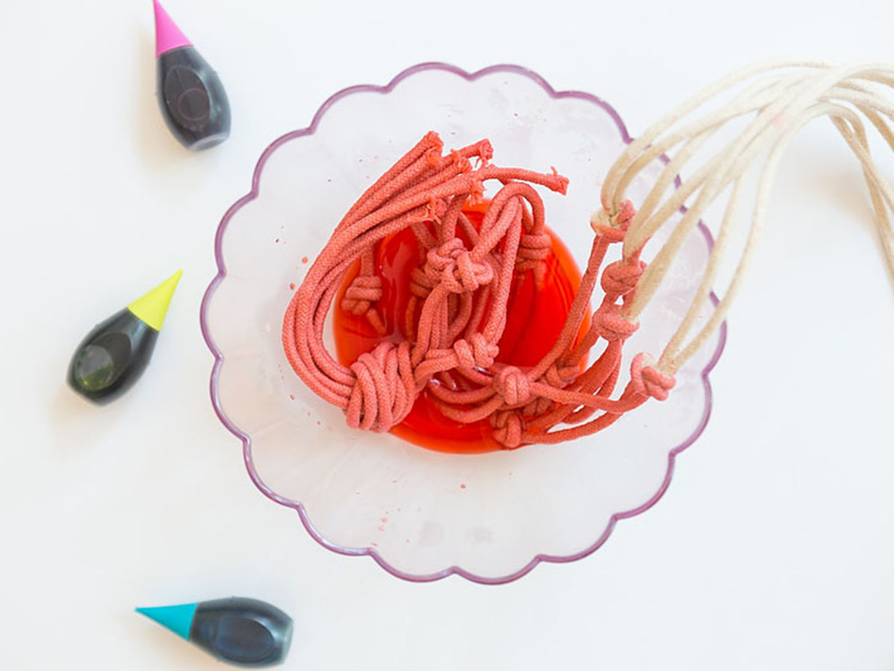 Remove your macrame from the vase and dip in food dye to color. You can dip all of the cording in dye or leave the ends natural. Let this sit in the sun to dry for about an hour.