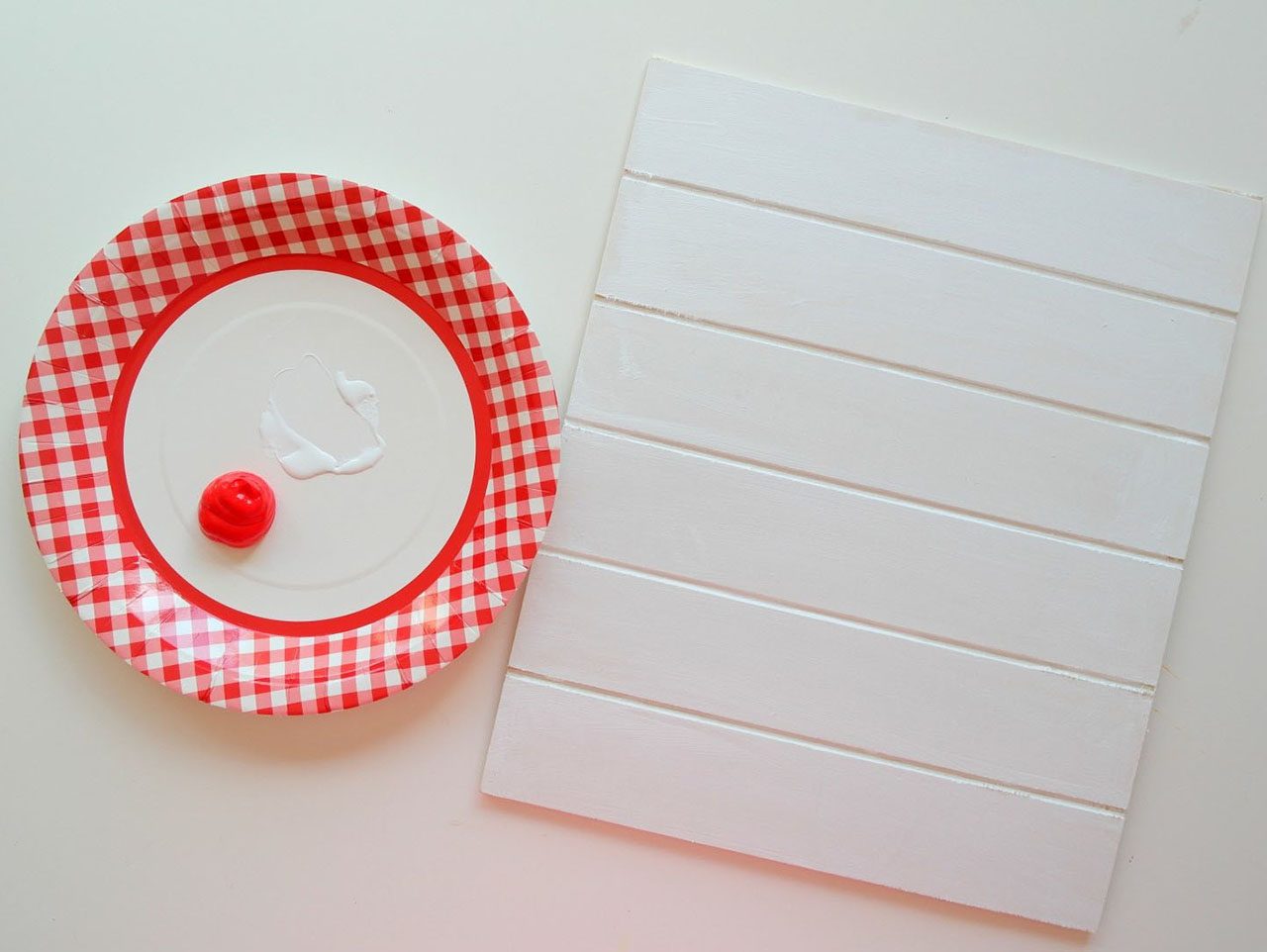 Start your DIY Slat Sign by generously coating the sign in White Tempera Paint using a foam brush from the PLAID Paintbrush Super Value Pack.