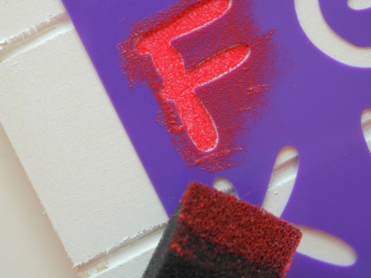 Select your ideal stencil front from the Awesome Alphabet Stencil pack. Gather a very small amount of Red Tempera Paint onto your foam brush.