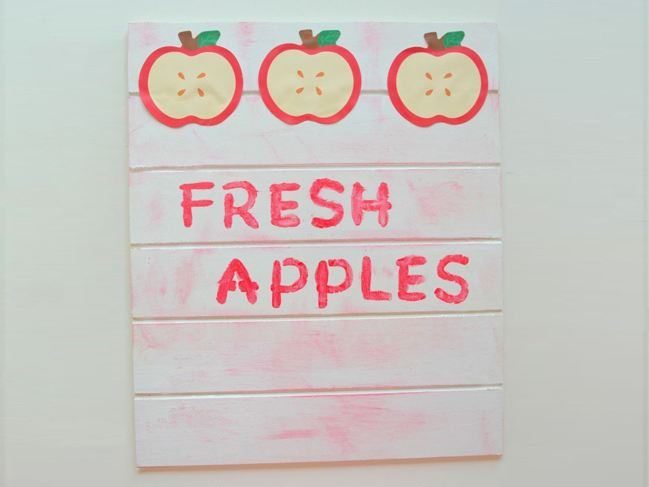 Repeat step four until you have stenciled out the phrase “FRESH APPLES”. With a very dry brush, gently sweep across the sign creating light red brush strokes.