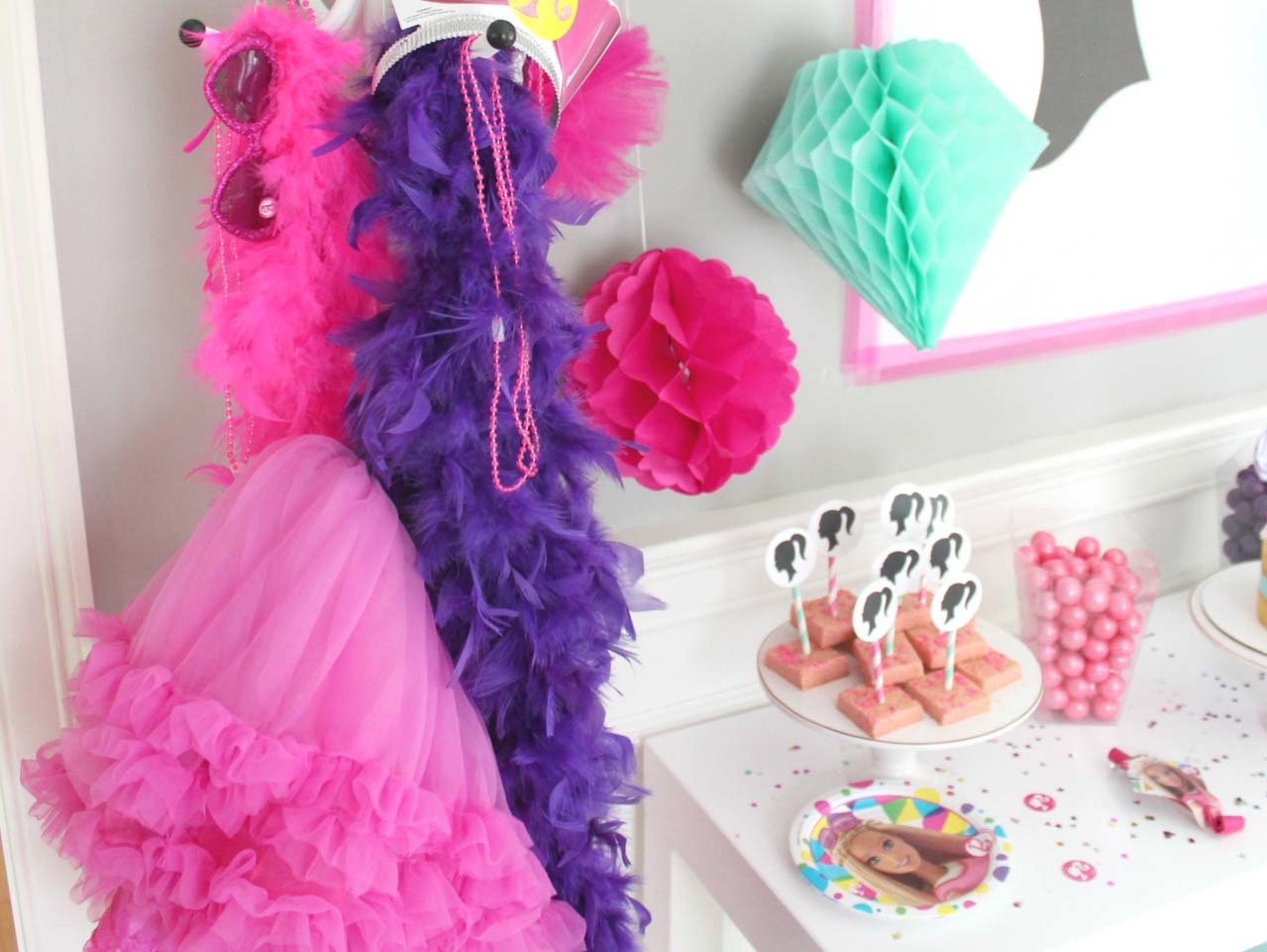 Fill the rack with tutus, fun dresses, pink and purple feather boas, necklaces, and Barbie sunglasses.