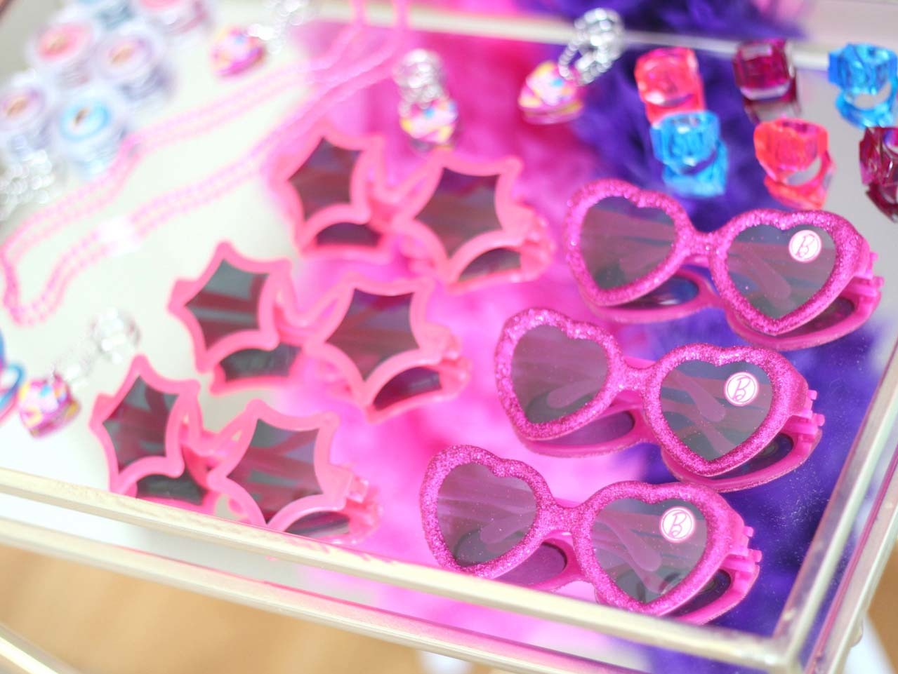 Fill the rest of the accessory tray with more Barbie sunglasses, star shaped sunglasses, rings, key chains, necklaces and bracelets.