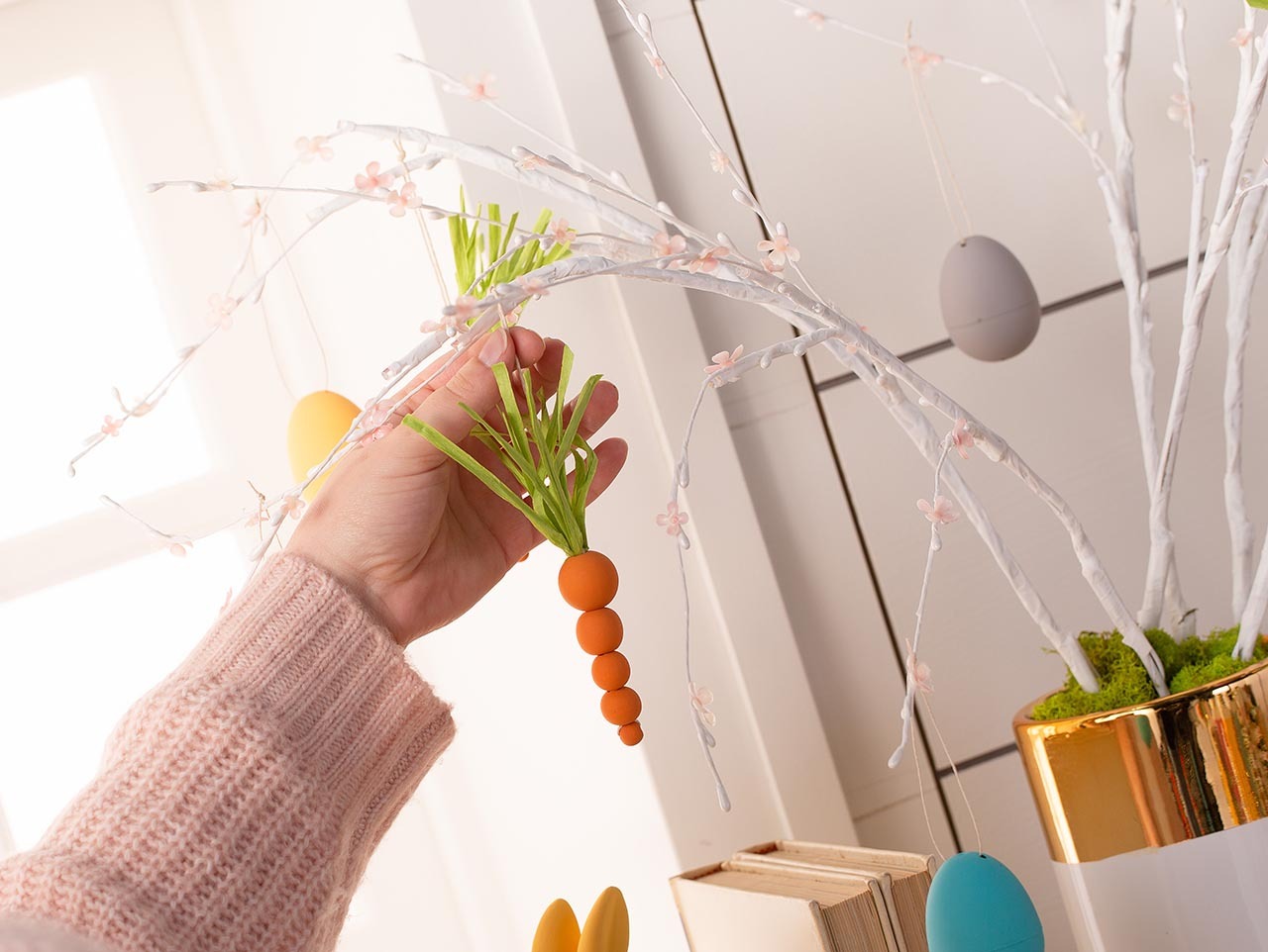 Time to enjoy your handiwork! These beaded carrot ornaments super cute on a white branched Easter tree – but they also look cute as accents around other Easter decorations. You can even tie one to an Easter gift bag or basket! Be sure to check out our other Easter Home Décor and tablescape ideas here.