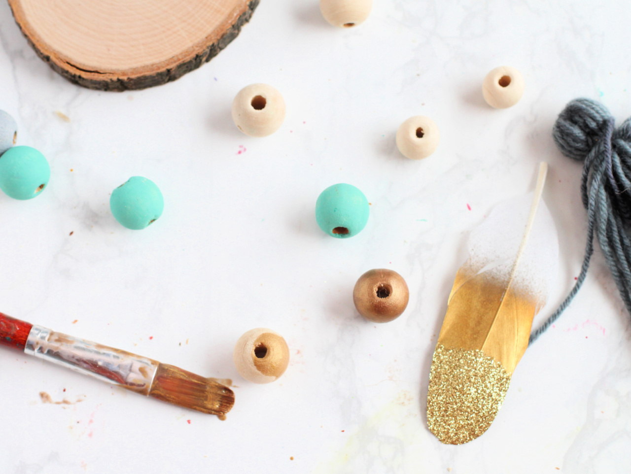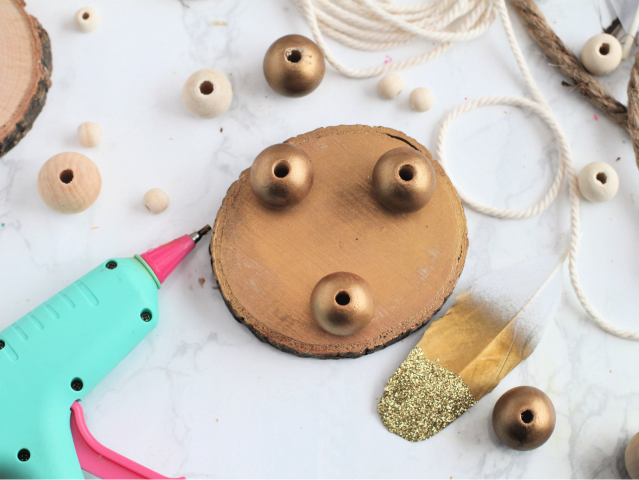 Paint 3 large unfinished wood beads with gold metallic paint.