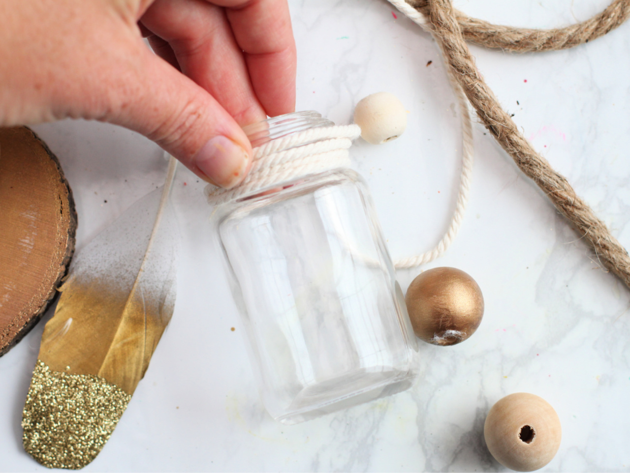Wrap the top of a Mini Mason Jar with natural twine. I used leftover twine from my DIY Macrame Wall Hanging Kit or you could also use jute rope.