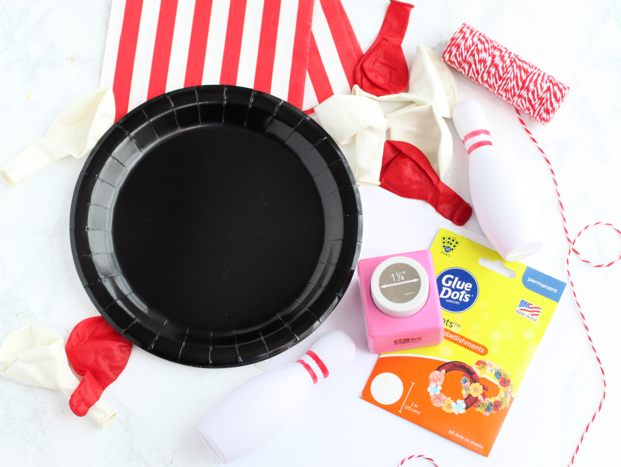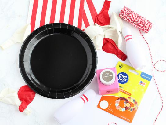 Use GlueDots to adhere your paper plate bowling balls to your party backdrop. Create a bowling pin inspired balloon garland using the White Latex Balloon Garland. Create a column of white balloons and then insert two rows of red balloons to create the red stripes on your bowling pin.