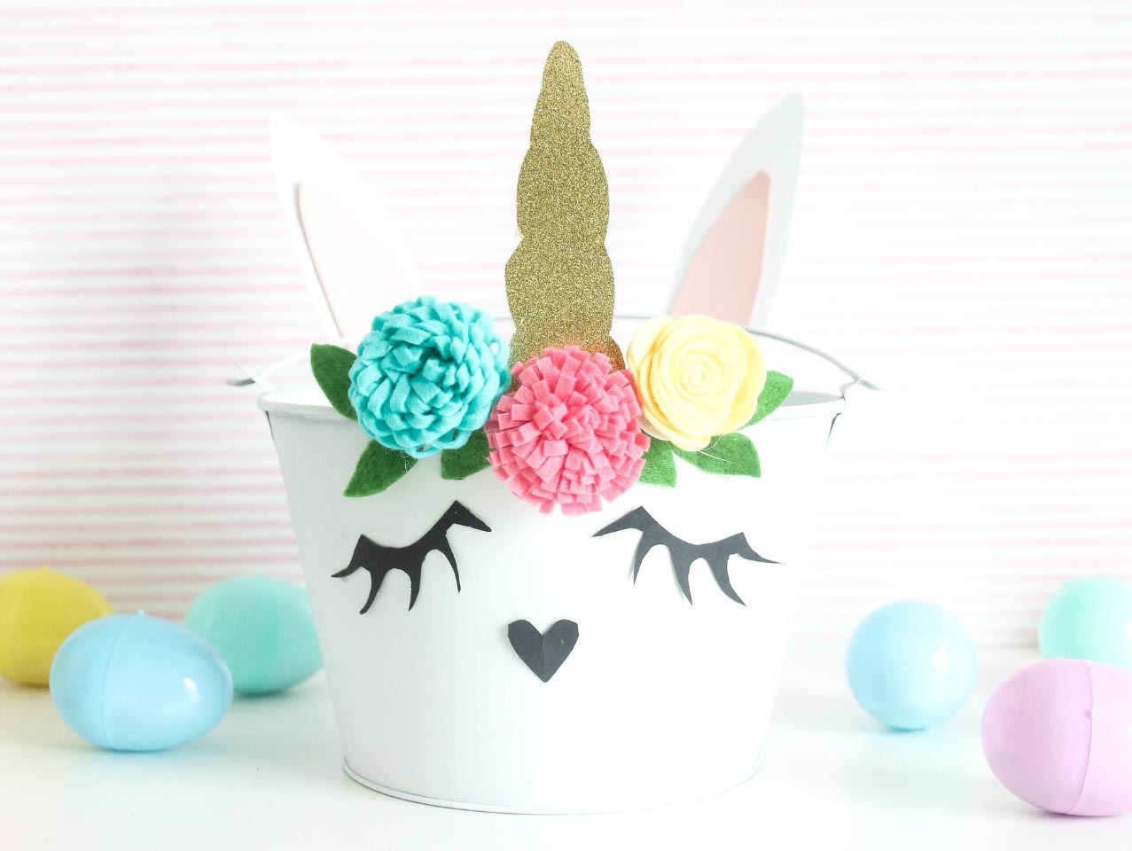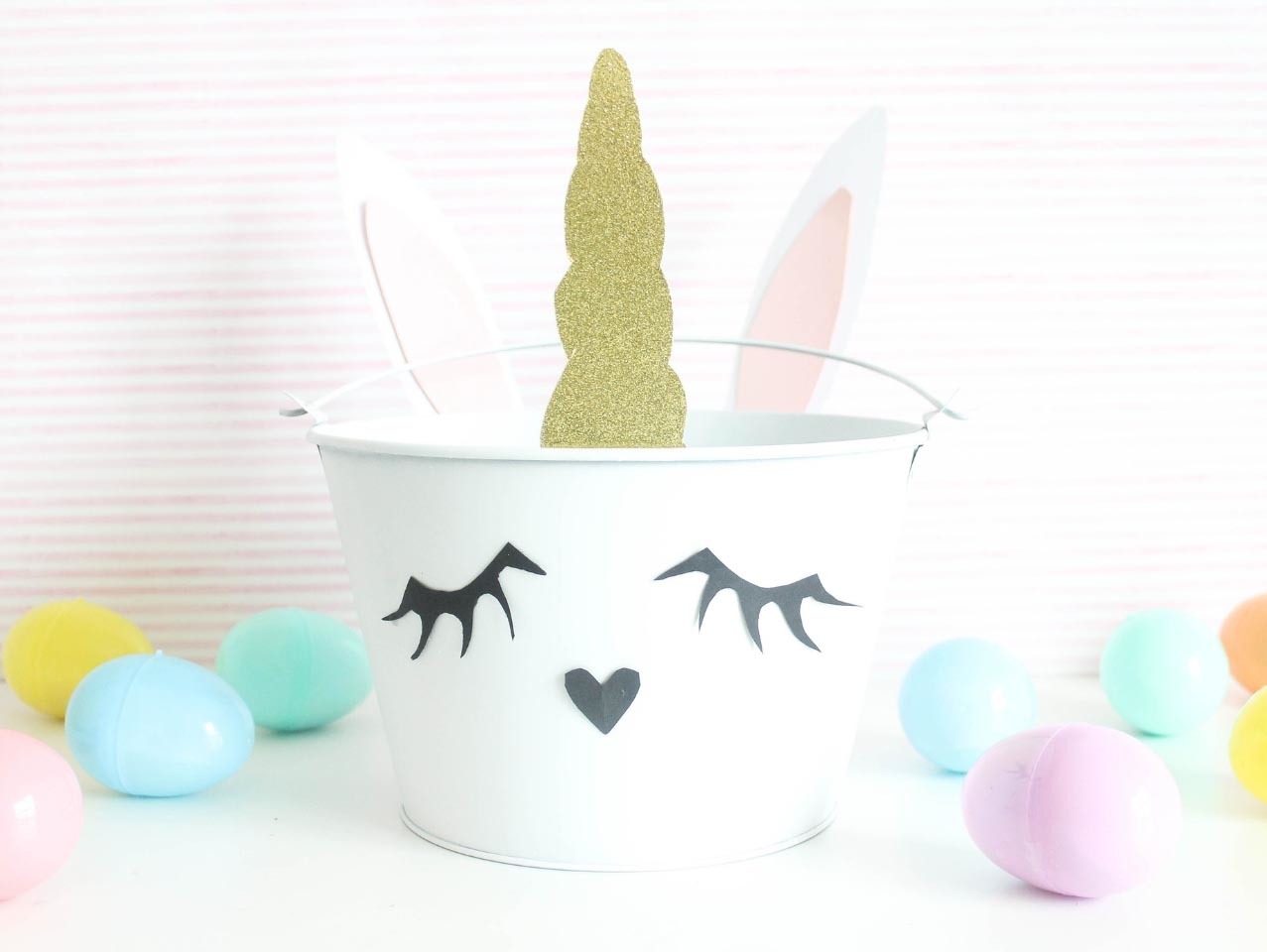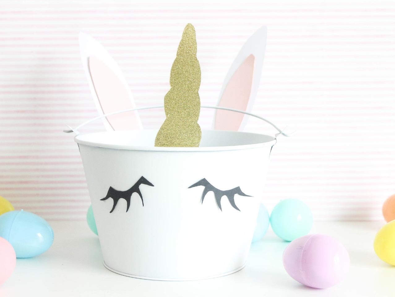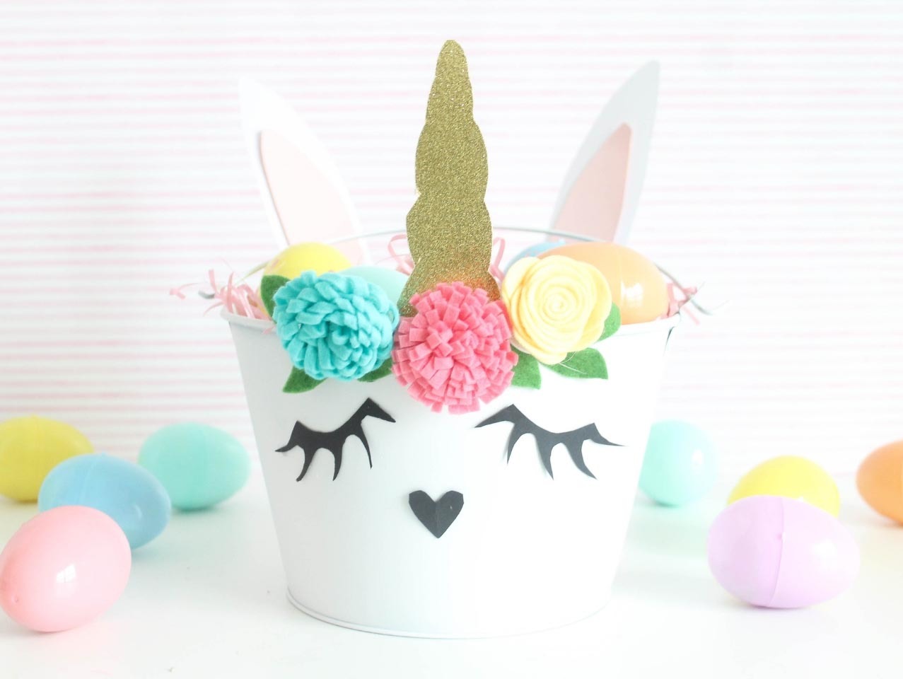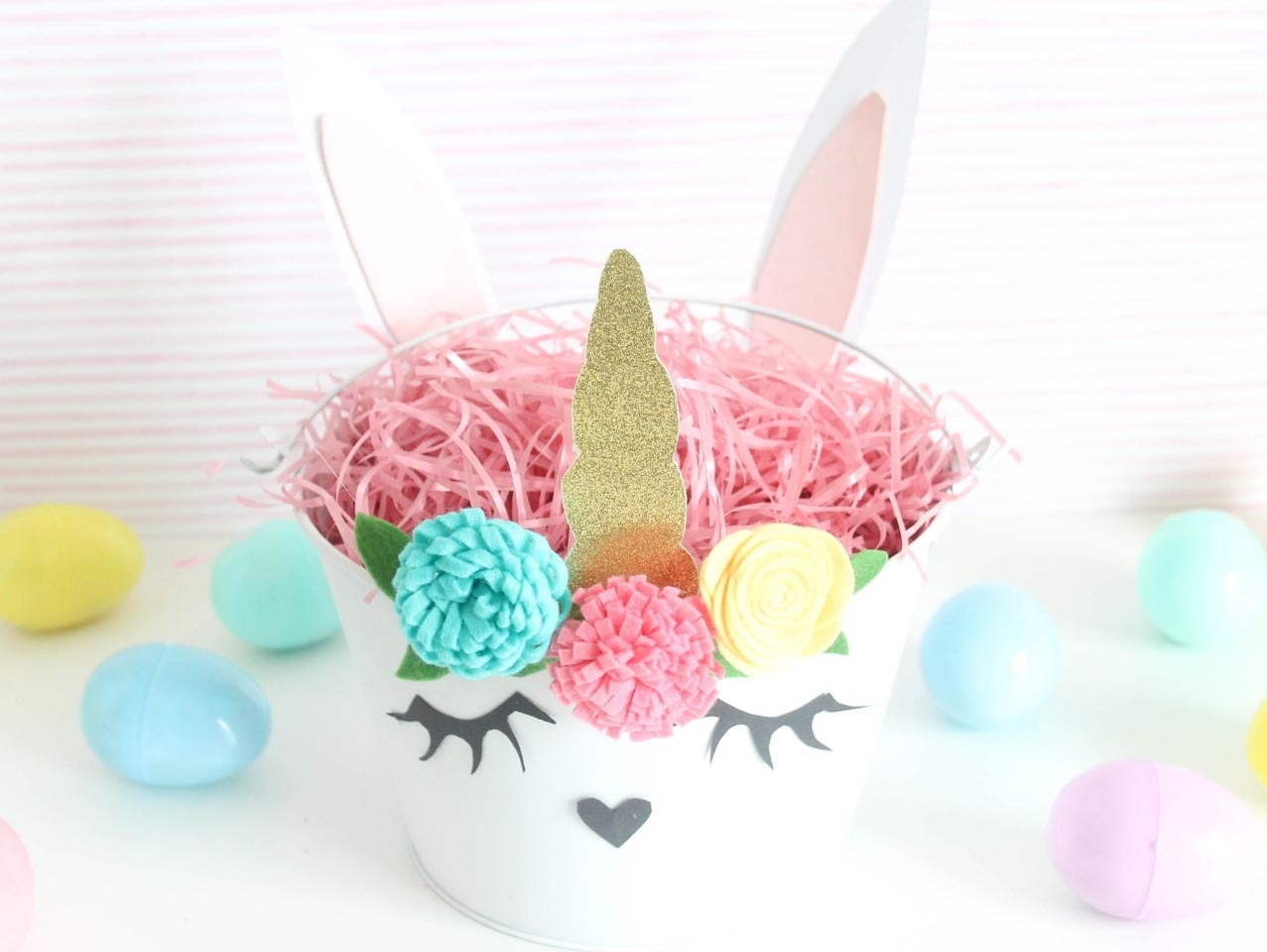 Lastly fill your DIY Bunnicorn Easter Basket with Stationary-Filled Jumbo Pastel Plastic Easter Eggs. Find 20 more Easter basket ideas here!