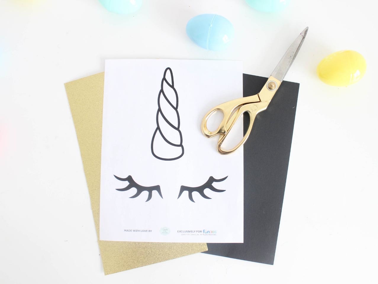 Download the Free Unicorn Horn and Eye Template here and trace the horn onto Gold Glitter Contact Paper and the eyes onto Black Cardstock.