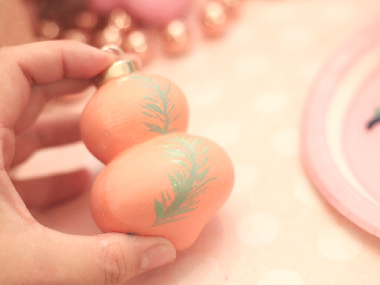 Paint the surface of a DIY Ceramic Ornament in your favorite shade of blush, coral, or pink. It's a great idea to use a disposable plate as a paint palette for quick and easy clean up! Once the base coat has dried, use a narrow paint brush to create a thin line as shown.