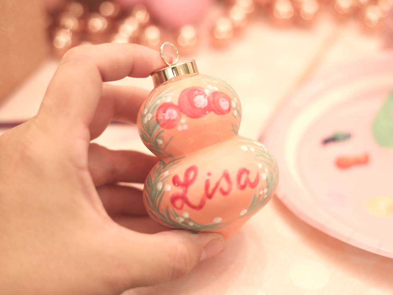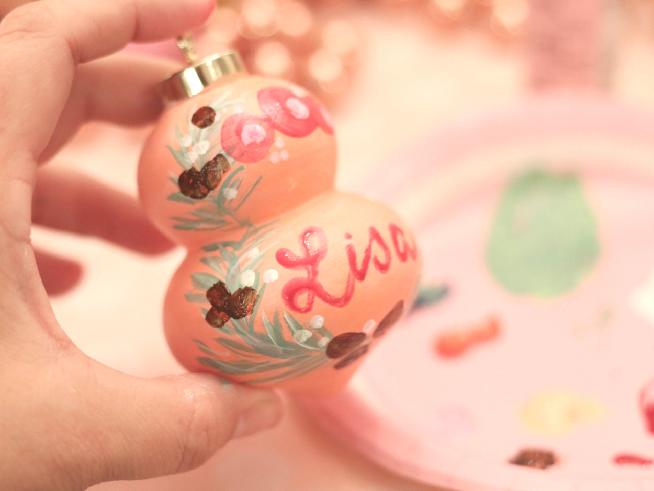 Personalize your ornament with the name of the recipient, a favorite phrase, or some flowers. Here, we've used red paint to create not only the name, but some pretty simple flowers. They're made by painting red circles, then going over the center with a pale pink paint. White snow berries are dotted in and add to the Christmassy look. Add a little Glitterific Paint in rose gold for a sparkling effect.