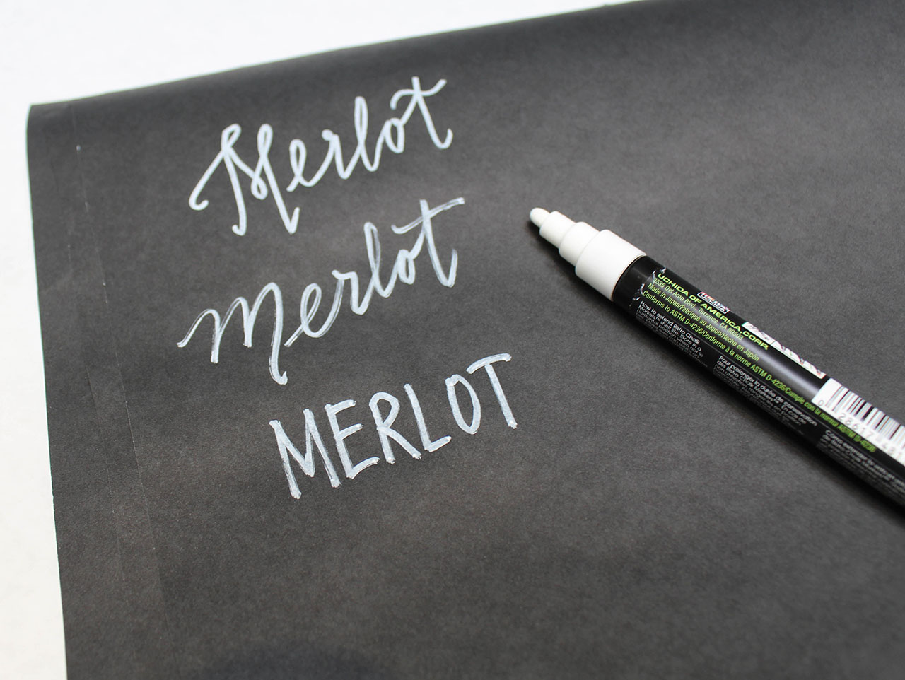 Once you know where everything will be placed, it’s time to write! Shake your chalk marker well, (with the lid on), and test the flow on a separate piece of paper before applying it to your project. Practice different handwriting styles and letter formations. Then when you’re ready, you can begin to write the name of each wine next to its corresponding bottle, and do the same for your cheeses and other edibles.