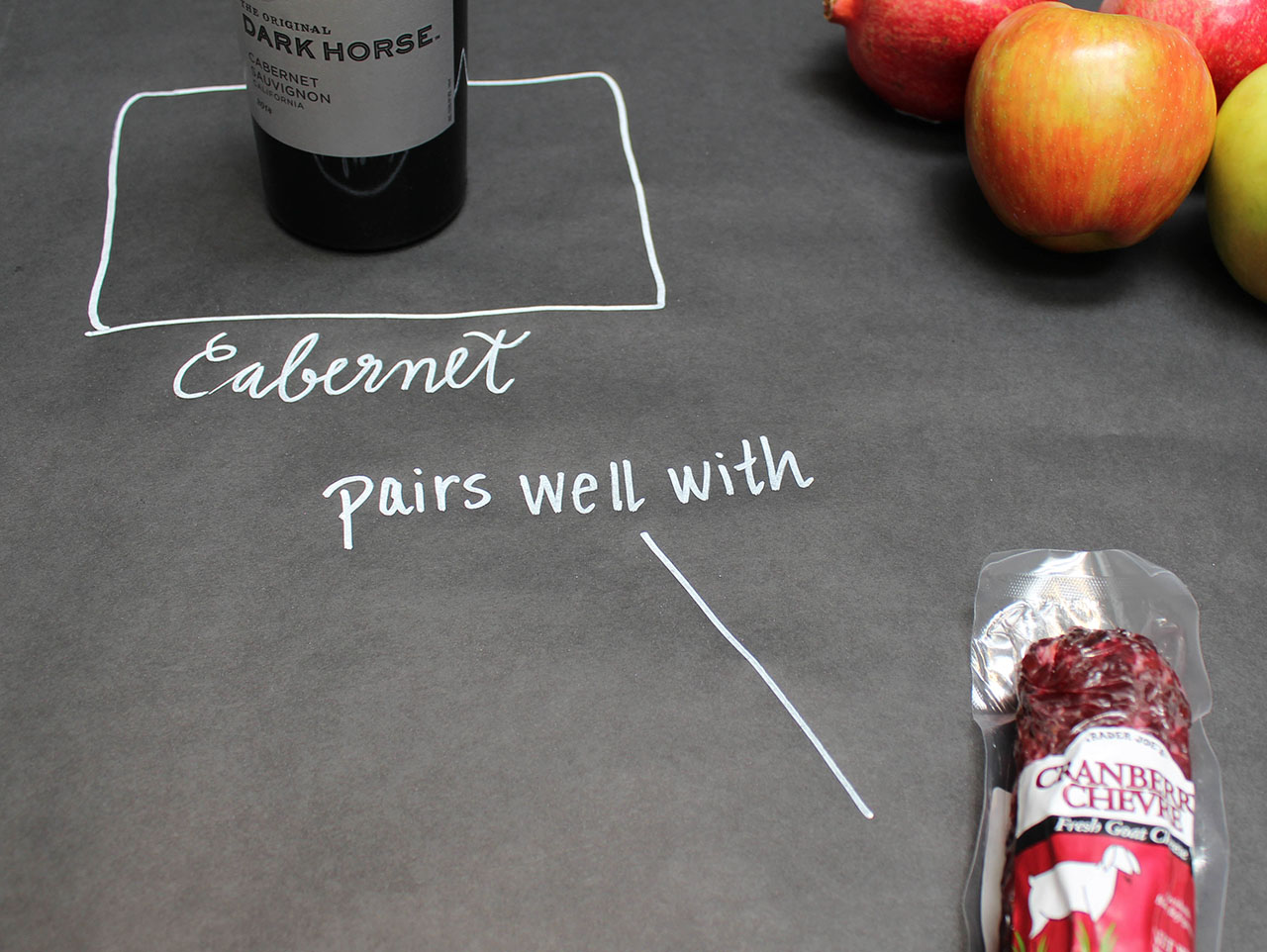 We drew a bordered area, on which each bottle of wine would be placed. Then, we added the words, “pairs well with” between the wines and the edibles, and drew lines to the items that matched up well with each wine. Get creative with your drawings, if you want to!