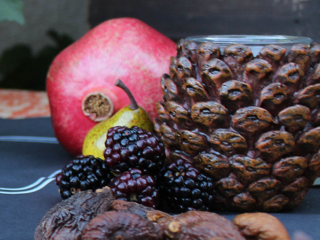 Add in some decor, like these beautiful pine cone candle holders and sprigs of seeded eucalyptus. We also added in extra appetizer items like our easy and elegant Fig, Pancetta and Arugula Flatbread, and an assortment of sausage, crackers and fruits. The complete look is robust and festive.