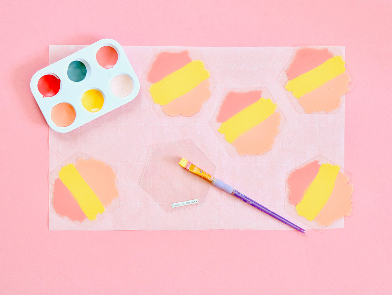 Begin by removing the protective film from the hexagon place cards. Working on a diagonal angle, brush on three stripes of paint that coordinate with your color palette. I chose two shades of coral with a contrasting mustard yellow in the center. The stripes can be as opaque, or transparent, as you would like.