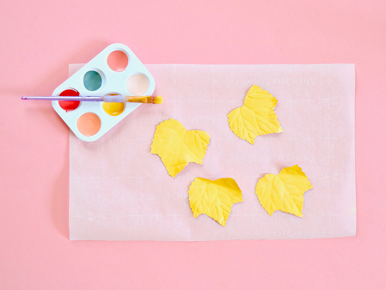 Next, choose several maple leaf shaped leaves from the mix of assorted decorative fall leaves and paint them yellow. You may need to add a few layers of paint to ensure they are fully covered. You could also leave them bare for a more natural look.