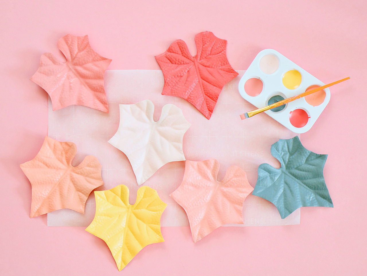Finally, place a large painted fall leaf in the center of each of your place settings and layer a Color Blocked Leaf Place Card on top of each to designate seating assignments during your Fall Pastel Bridal Brunch!